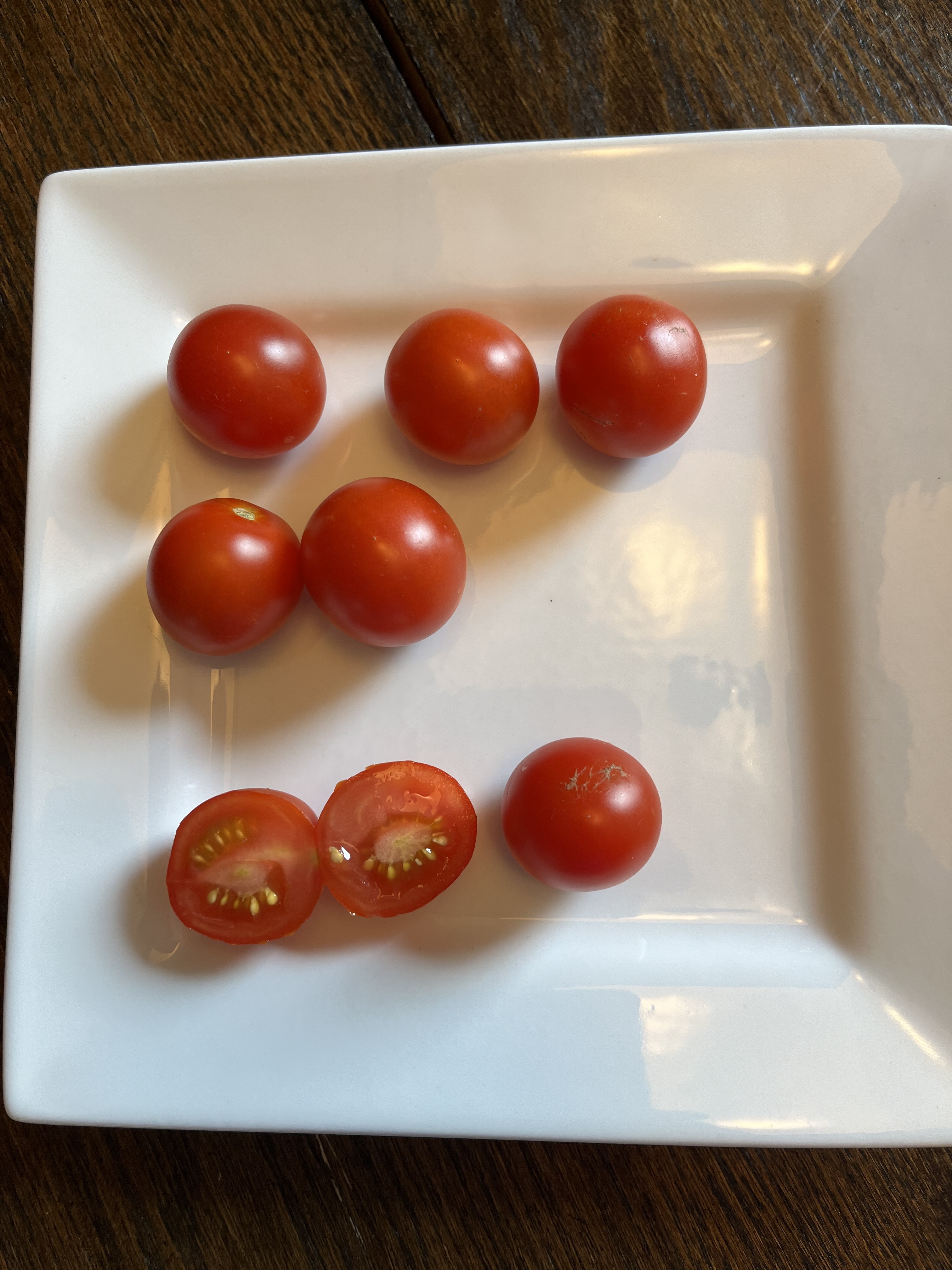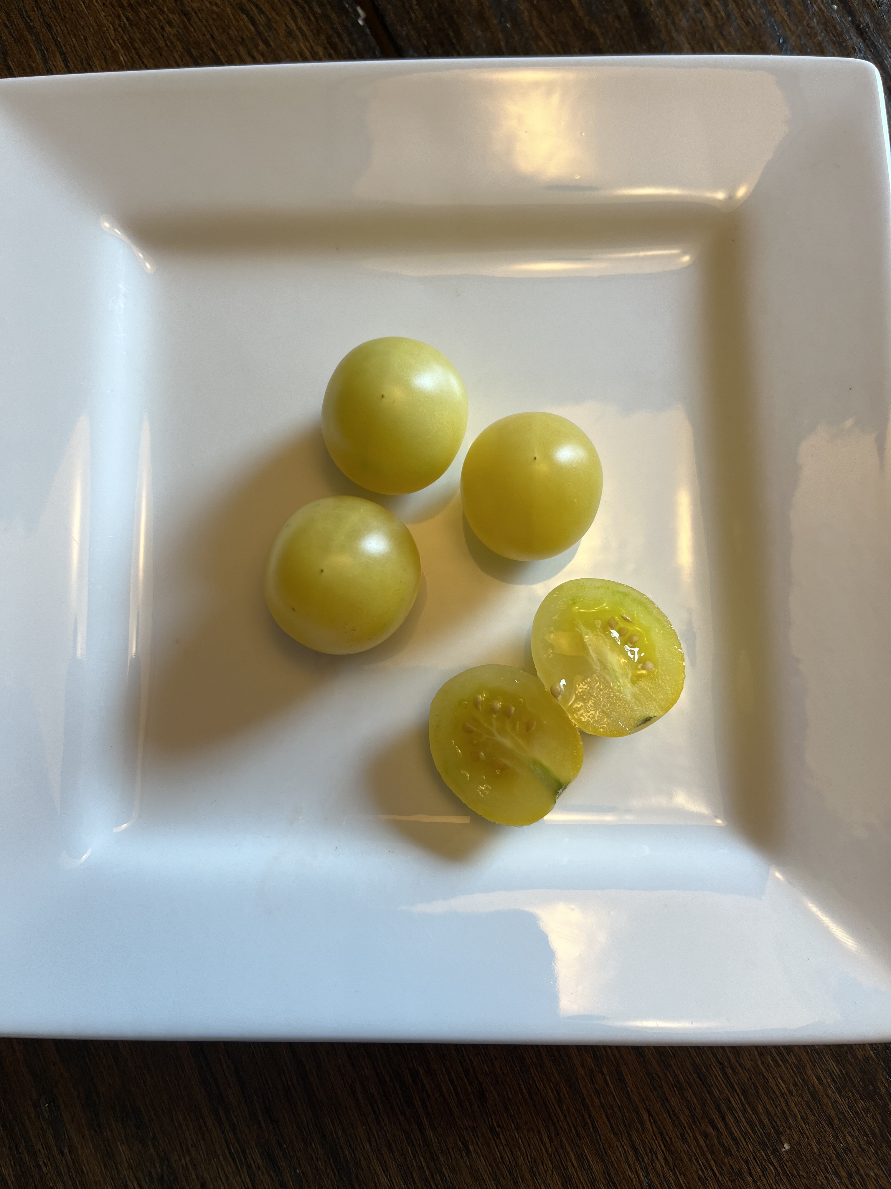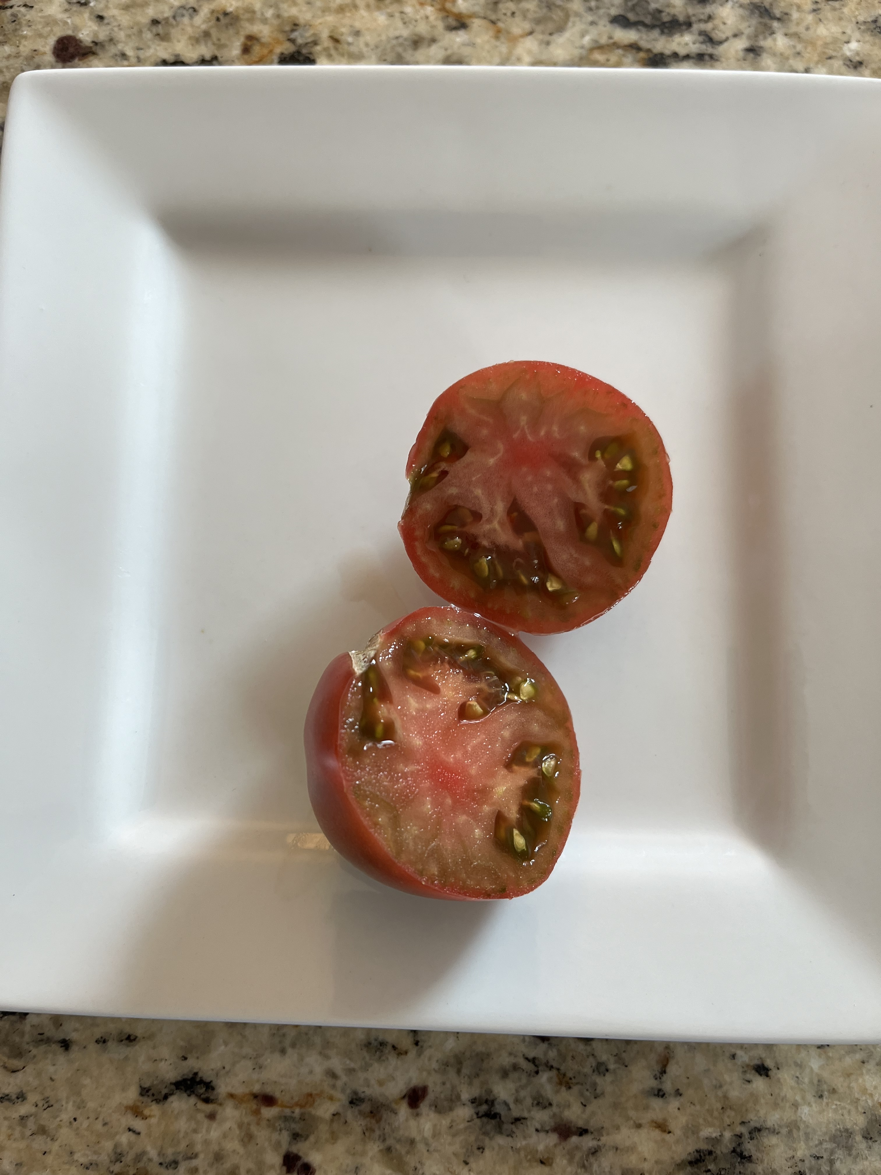 First dwarf tomato this year— Mary’s cherry. Good cocktail size, less sweet than some of the sweetest ones. Very juicy. Lost 2 of 3 ripe ones to huge cracks. This one had a large crack too but was the best of 3.