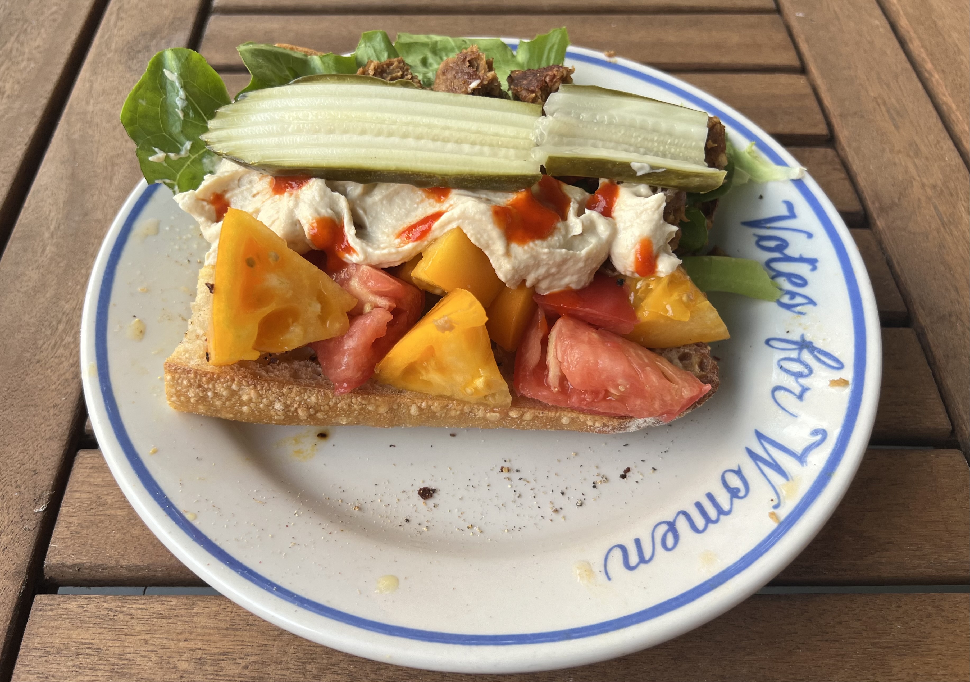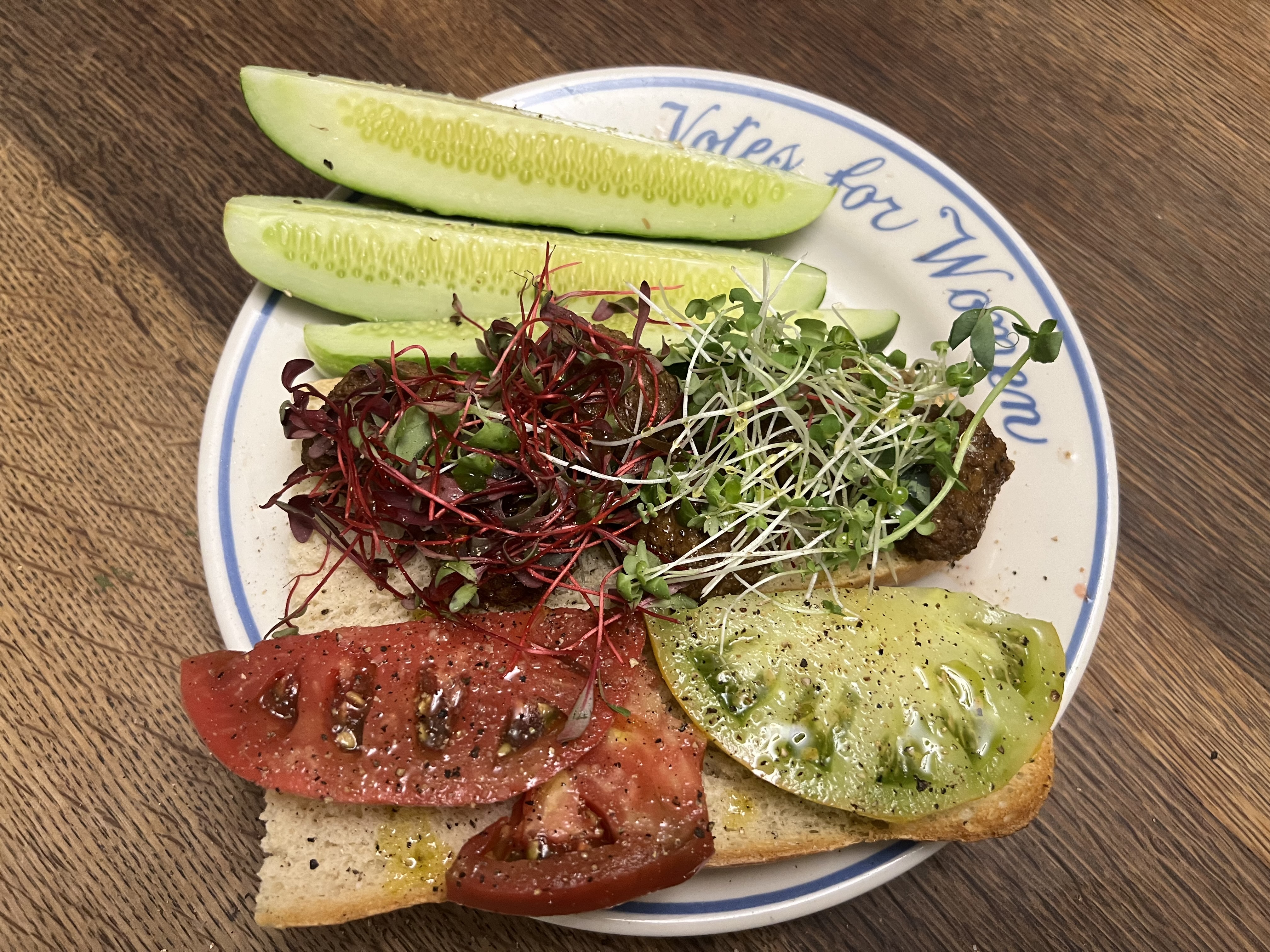 I’ve been enjoying various tomatoes on open face sandwiches. Cherokee Green and 1884 Purple with some vegan meatballs, microgreens, olive oil, salt and pepper on a baguette.