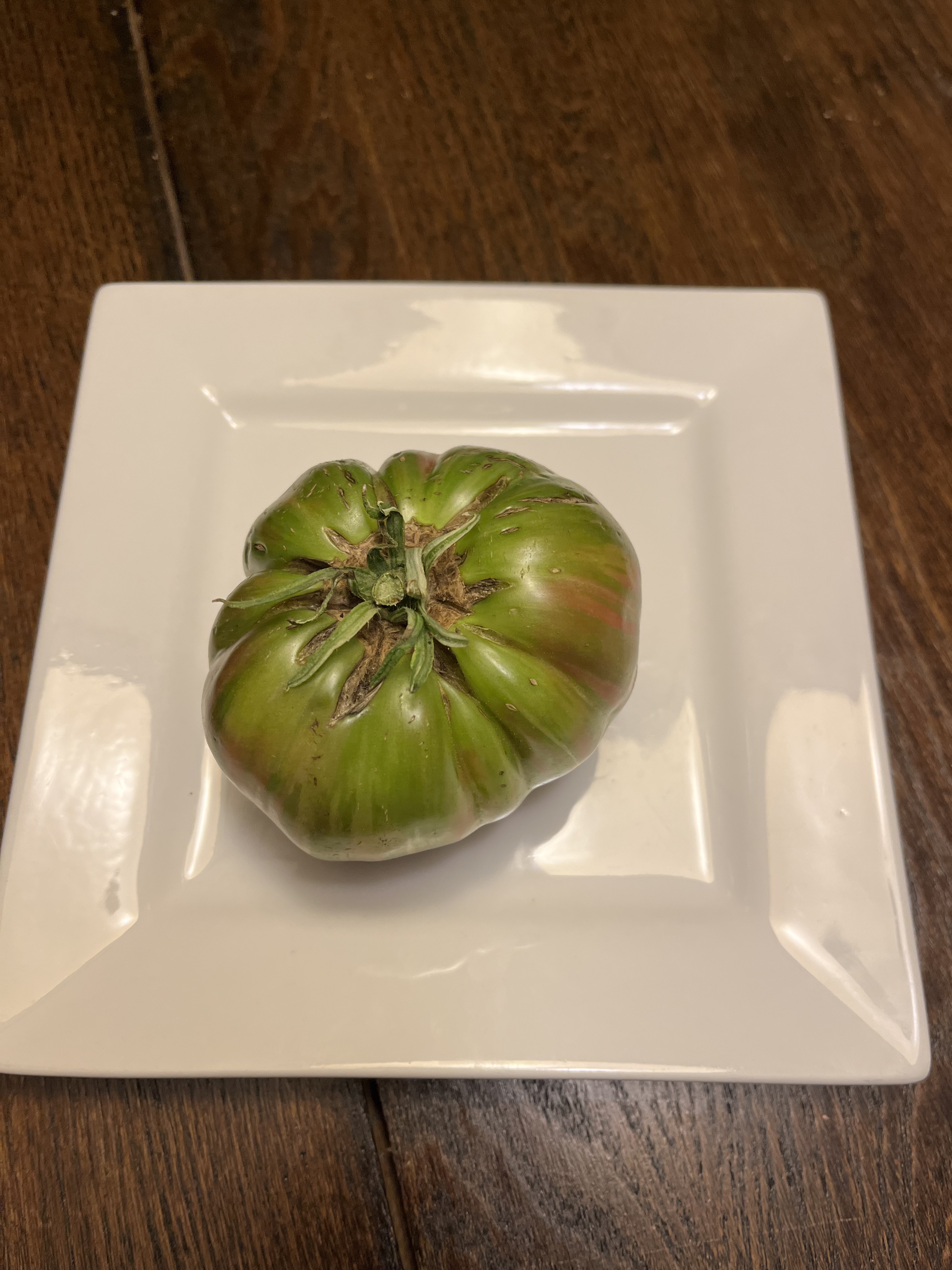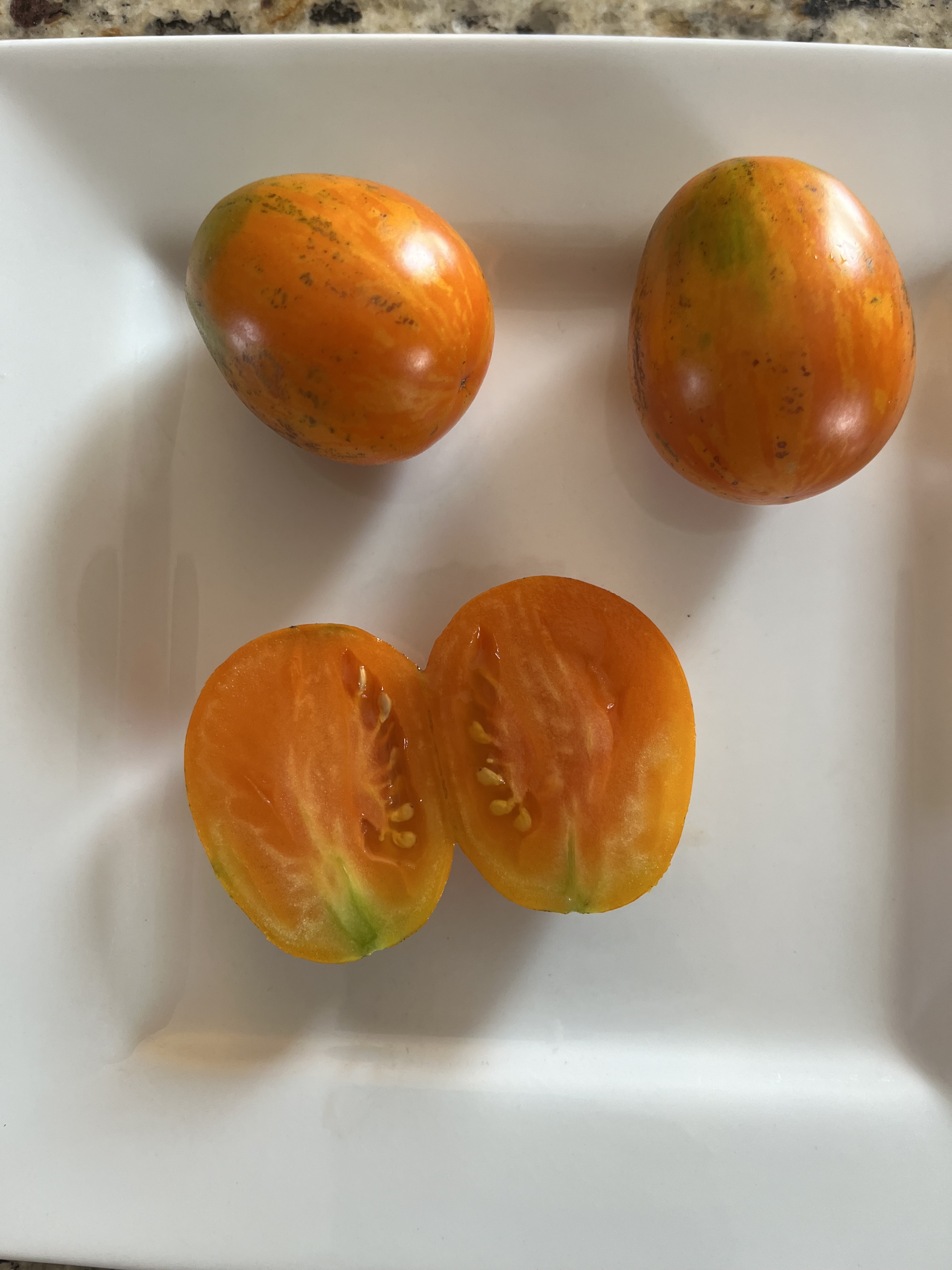Apricot Zebra- very prolific producing plant. My first one of the year was kind of ehhhh. As they keep coming in- I’ve changed my mind- I am a really big fan and usually these are eaten fairly quickly. It has really good sugar, and a meatiness that I really like. Cocktail size—slightly smaller than a golf ball.
