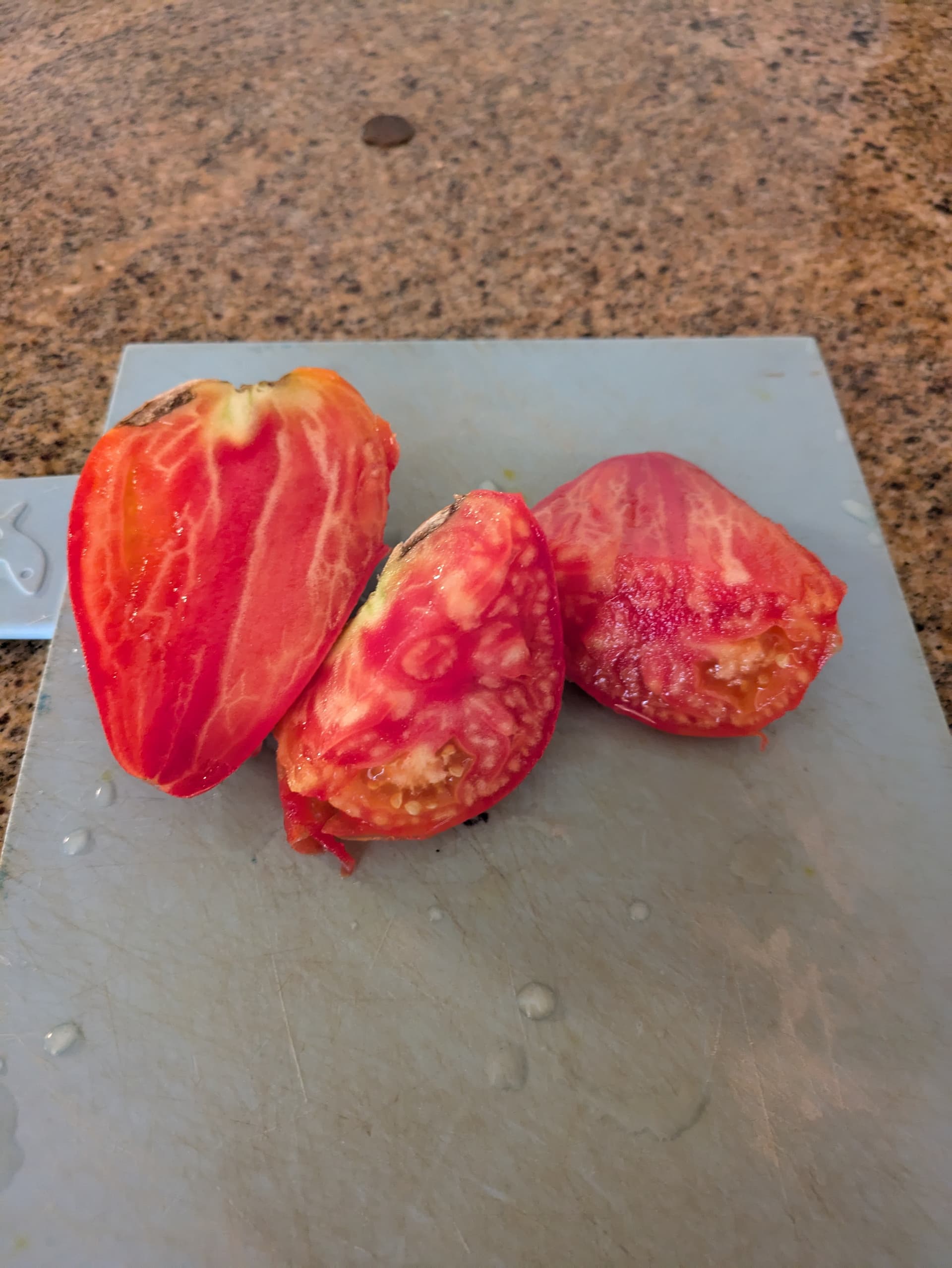 good flavor, not very sweet, meaty, very few seeds. I’m looking forward to making sauce with this one once production kicks in.