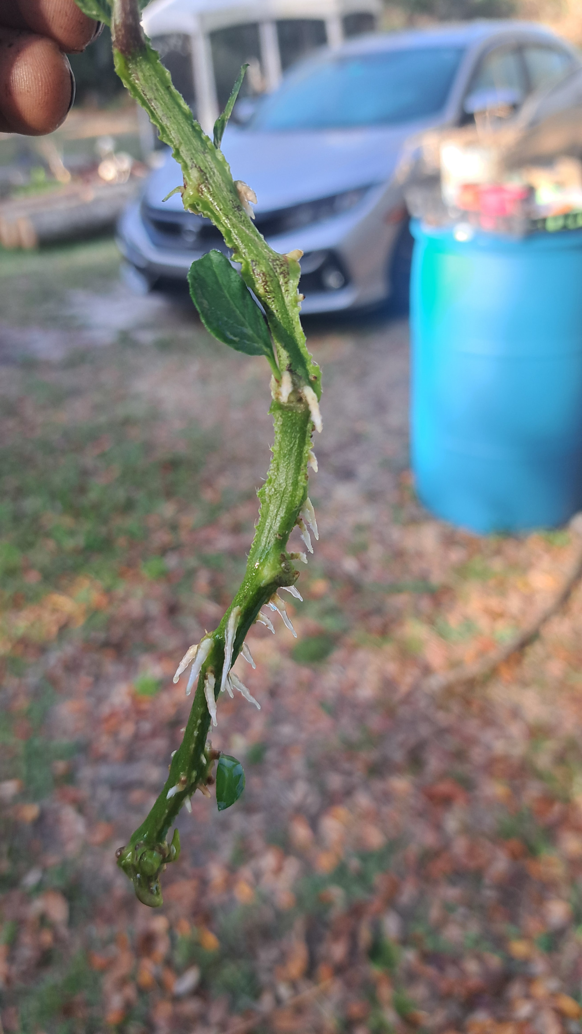 I did a test to see how well pepinos root in water. I don’t remember exactly when I started it, but at the earliest it was last Saturday (2/28) but it was more like Monday (3/2). So in at most 5 days, this what the roots look like (from a non-ground touching branch).