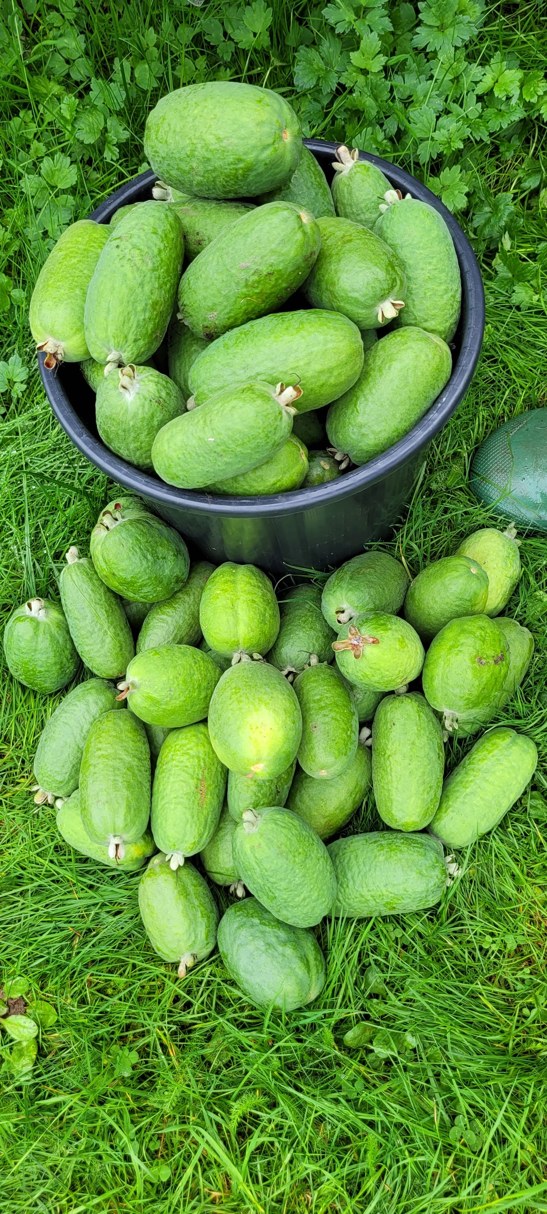 My eyes try to decide if those apples are small or the feijoa are huge.
