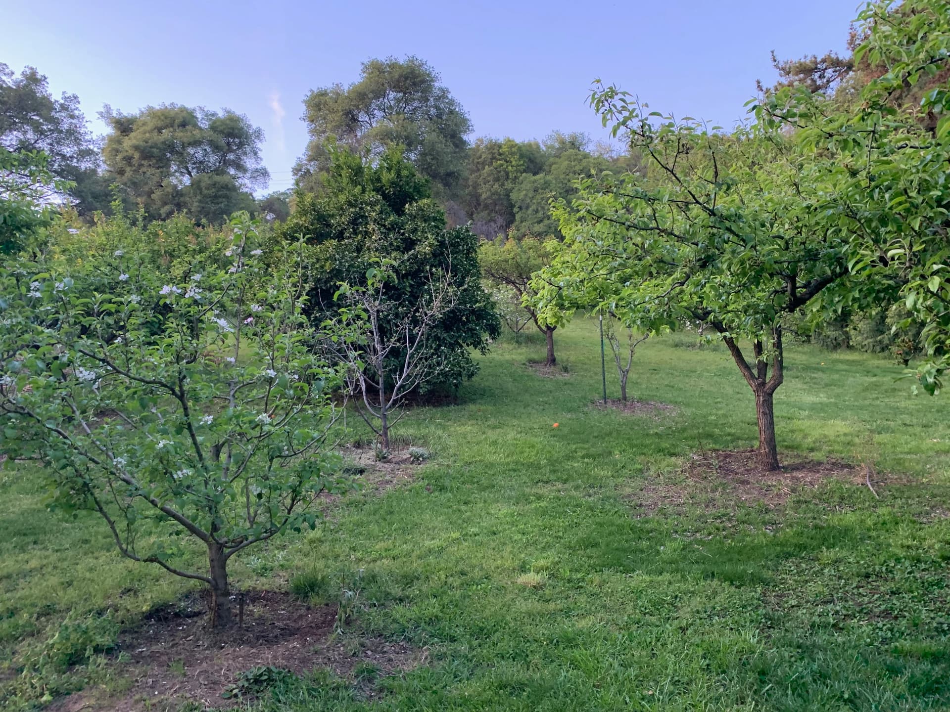 I’m in Zone 9b, Northern California. Previous owners planted the main orchard as 4 rows going straight up/down a long hill, sloping from near-flat to roughly 25+ degrees angle at the top. I think most of the trees were planted on the natural slope without any cut-back into the hill or any berm on the downhill side, to make a flatter spot. The natural soil type in my area is like a weathered decomposed granite, and there is grass planted everywhere in between.