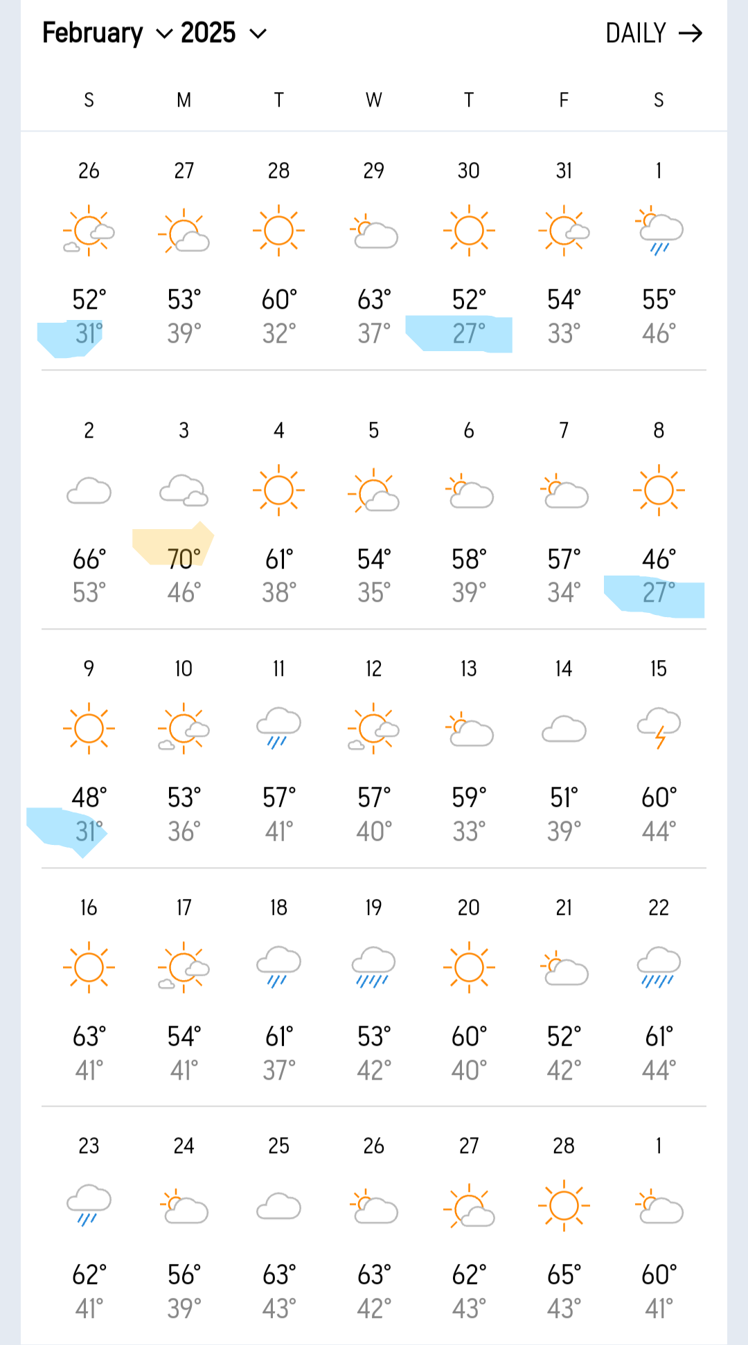 This January was way, way colder than normal, with very few breaks in between the cold nights, and even so we got some 70s. February is forecast to be much more forgiving, only two frosty nights. I hope itâs true, we deserve a milder February after this January.