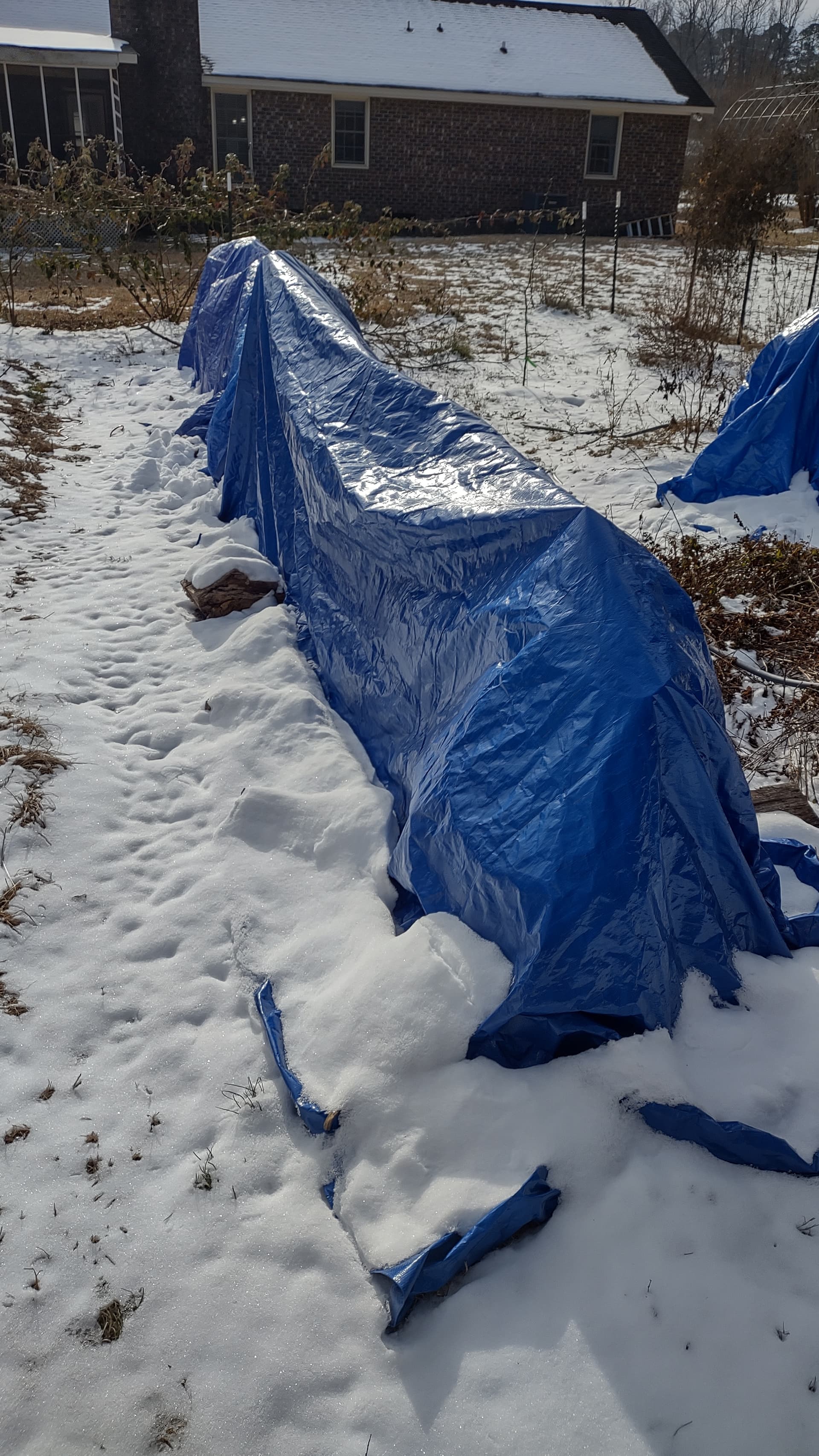 Anxious to find how how things are looking under there. A number of citrus and other plants remain covered and lit with Christmas lights until the cold finishes.