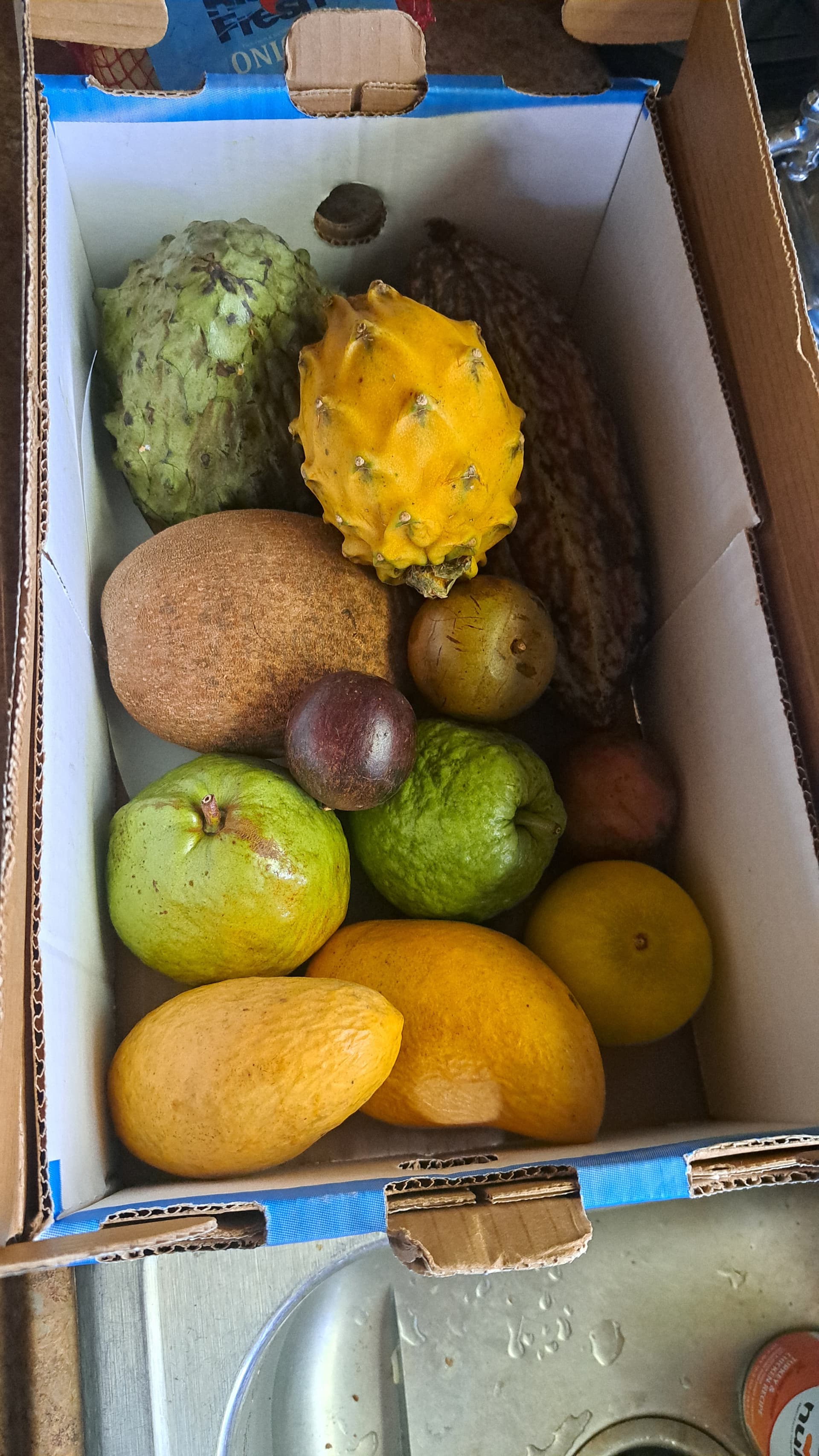 No tropical fruit yet, but I have passionfruit and calamansi ripening and peanut butter fruit about to bloom. My barbados cherry has a couple flowers, but it hasn’t been pollinated once yet, so not holding my breath. I need to clear a path to the sea lemon in the woods so I can check on its fruit easier.