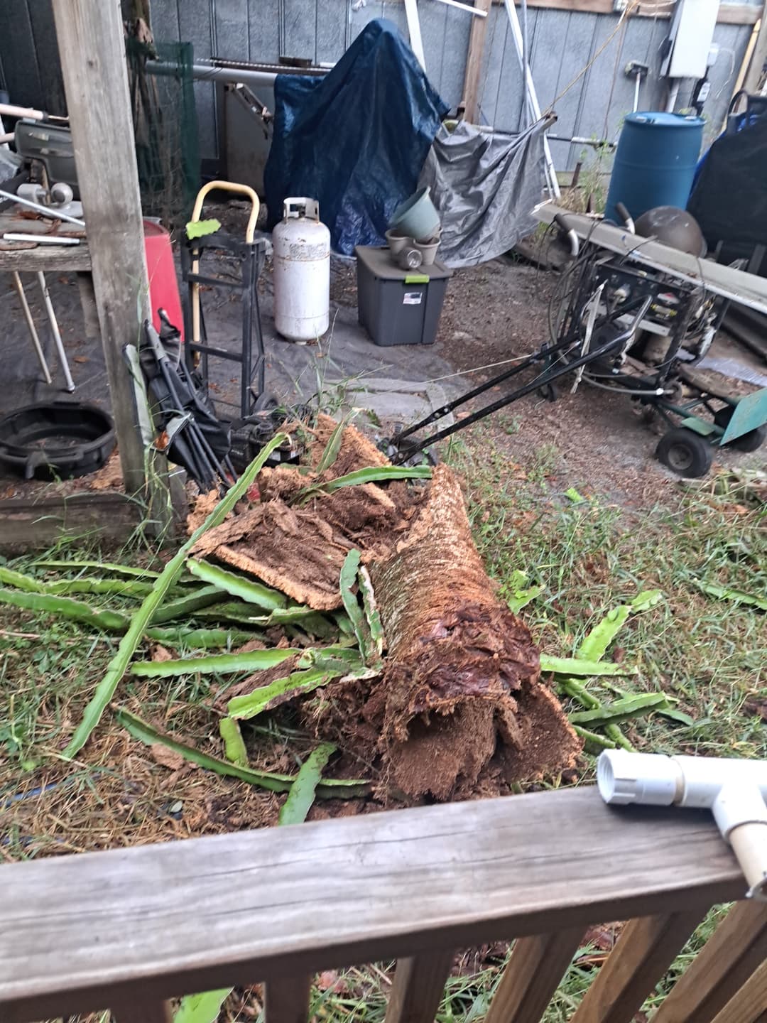 This palm tree in the backyard just fell on my tiny house. It was so loud I thought the AC I turned on in the middle of the night exploded. No internal damage, too dark and rainy to see if it dented the roof or crushed any plants. It could have crushed like 50% of my potted tropicals if I didn’t put them in the greenhouse this morning, its like it waited for me to move them. The good news is I can reach my dragonfruit now though, if it didn’t get squashed. Bad news is theres a palm tree on my house now.