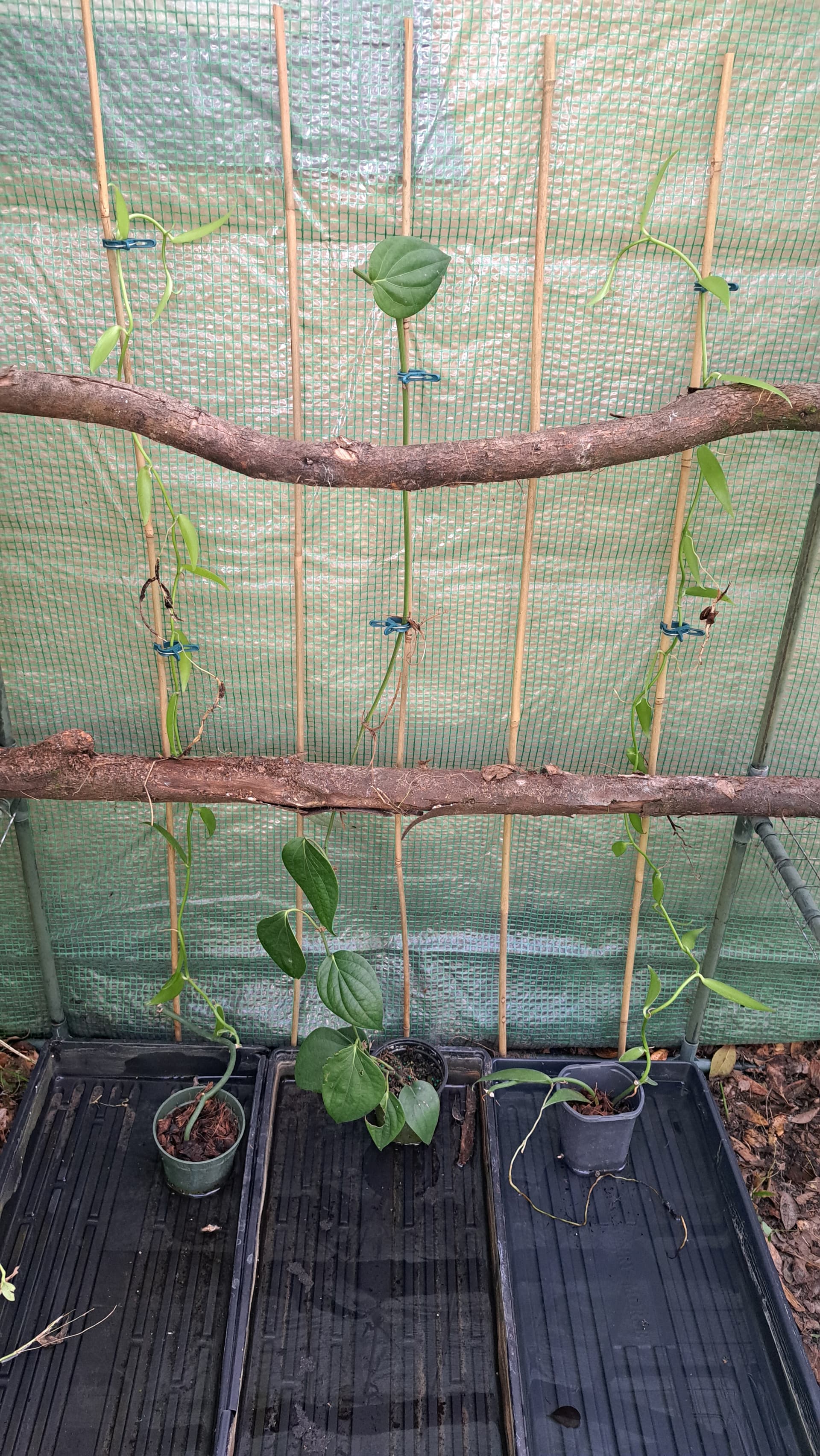 My larger greenhouse has started to fall apart, so I had to order another one. In the meantime, I’ve moved my vanilla and black pepper vines into my small greenhouse. They were growing all willy nilly before so I staked them up some and gave them some pontential logs to branch on. I also trimed the pepper vine and attempting to root the cuttings. Hope they do well.