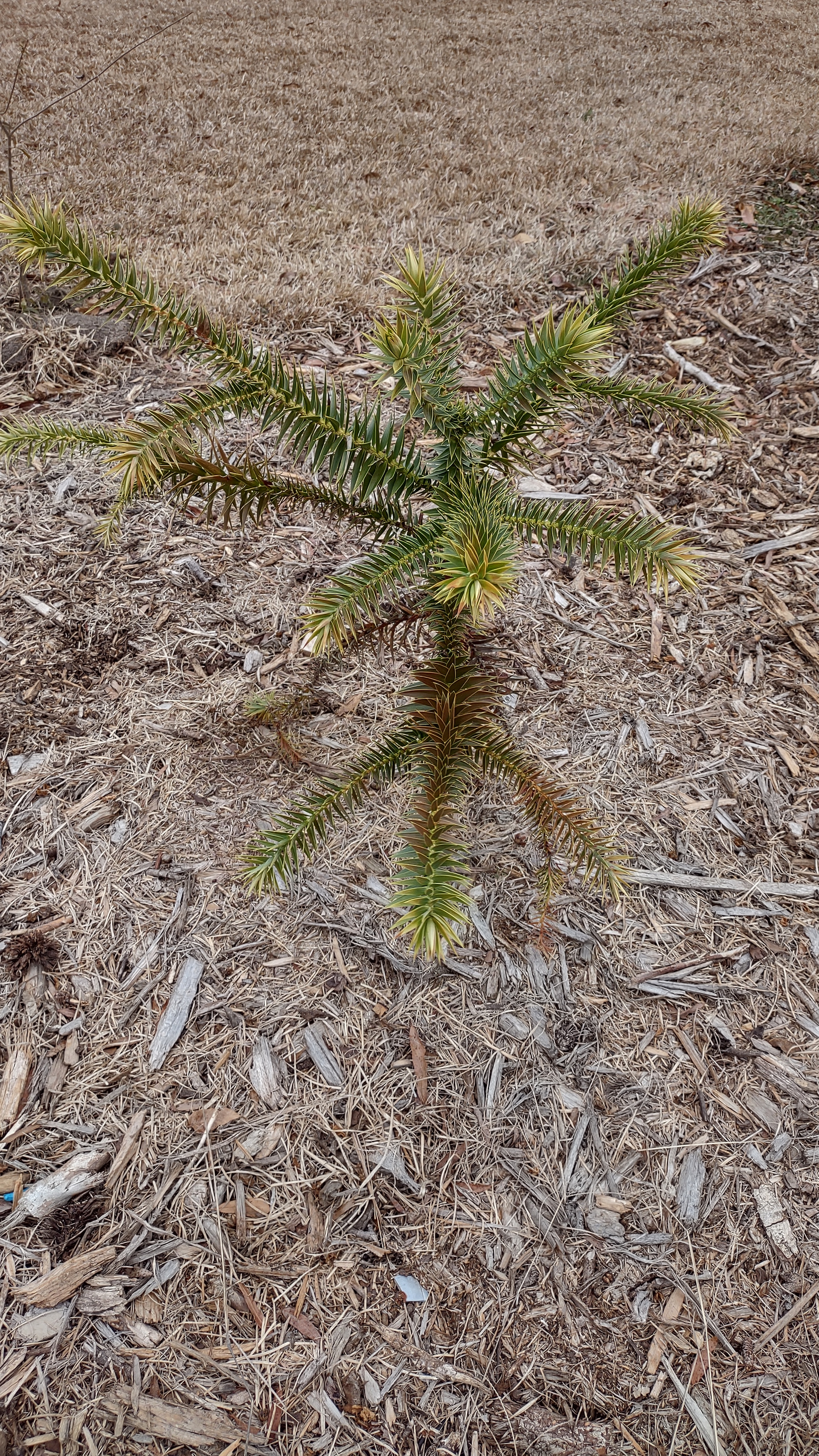 Parana pine is a bit bronzed but pretty decent looking for now. It handled two nights at 12 F last winter as a much smaller and less healthy plant, so I’m confidant it was not damaged at 8-10 F.