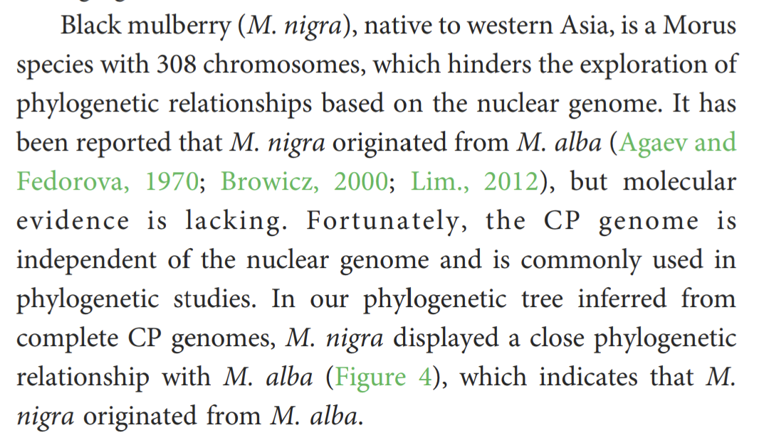 I recently came across this interesting 2022 paper that did full-genome comparisons for the chloroplast DNA of a few Morus species, including nigra. The full paper is attached below, but here’s the interesting bit to me:
