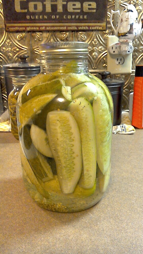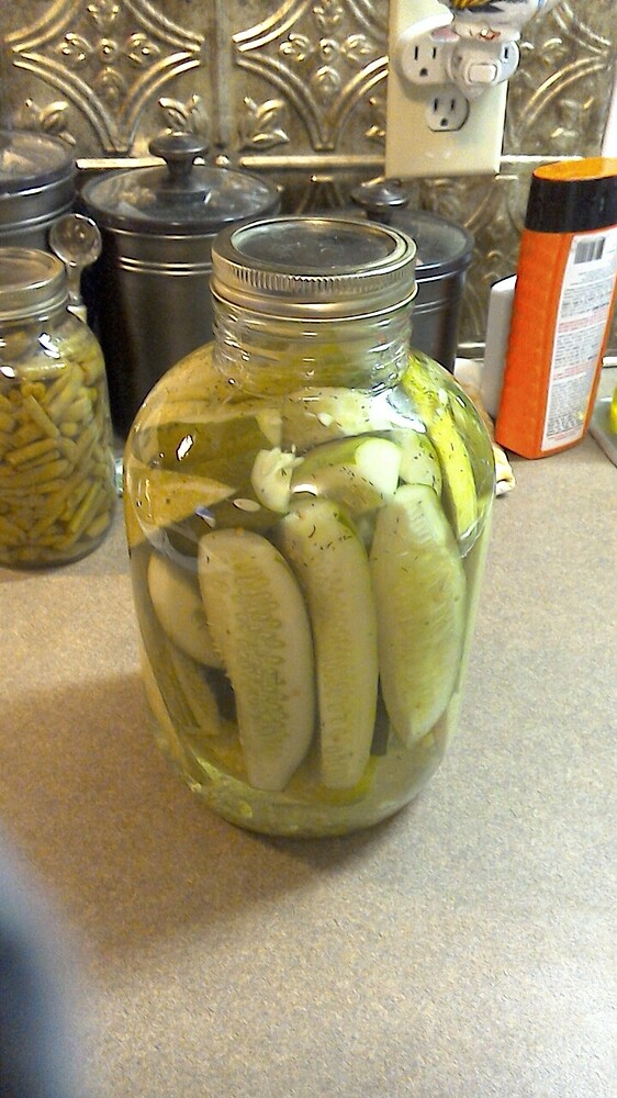 To hers and my surprise, she came back in with an apron full of them, maybe 5lb worth. We had just canned 7qt of fresh picked green beans, so she wanted to make some salt pickles. She had found a half gallon jug in the cellar and made the pickles while I was out mowing. Here is a pic of them, plus our first batch of canned half runner beans.