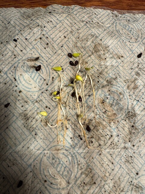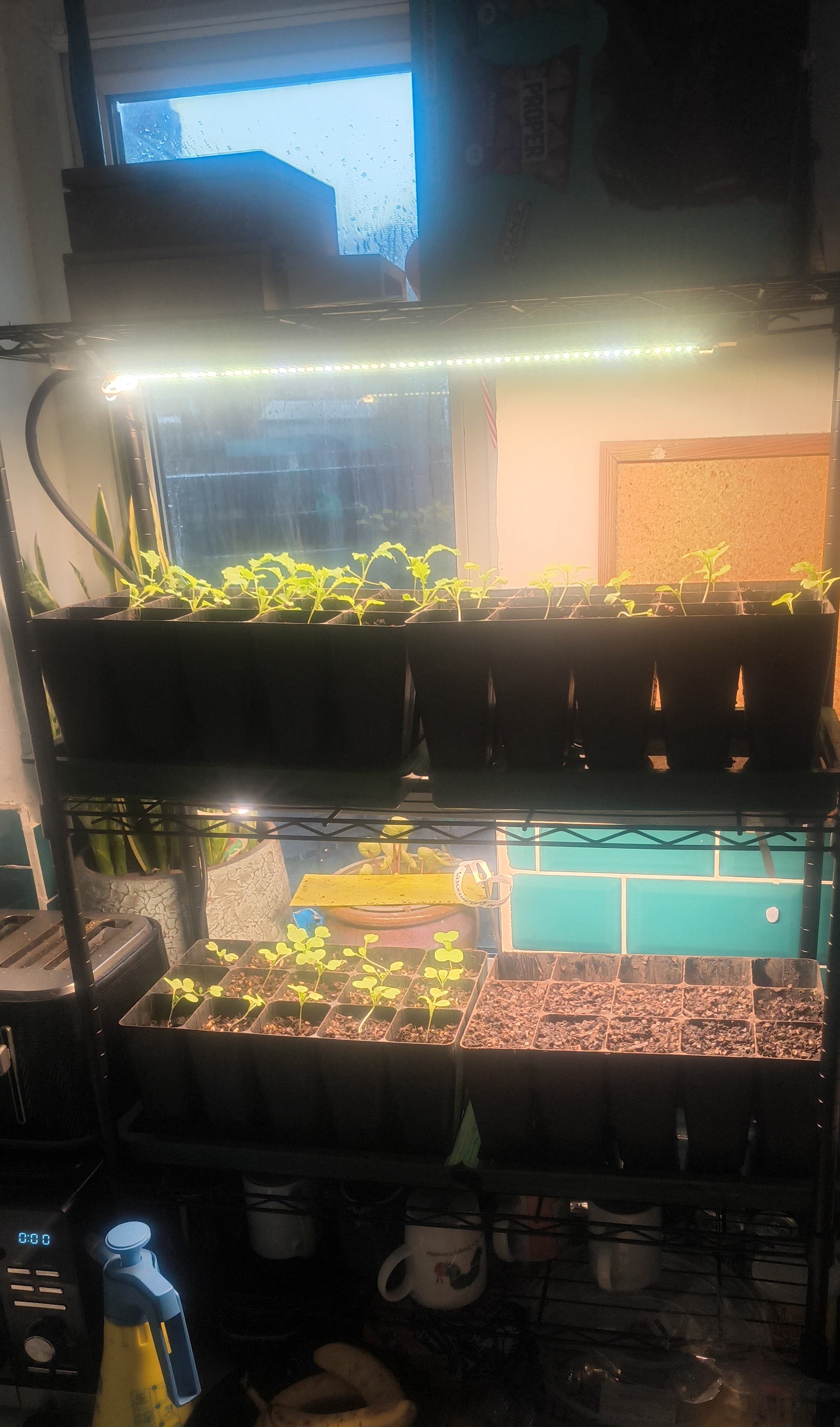 I had already made a lil propagation rack up in a neglected segment of kitchen counter for some of Steven Edholms seeds so while they are stratifying these can join the brassicas I already had going to try it out.