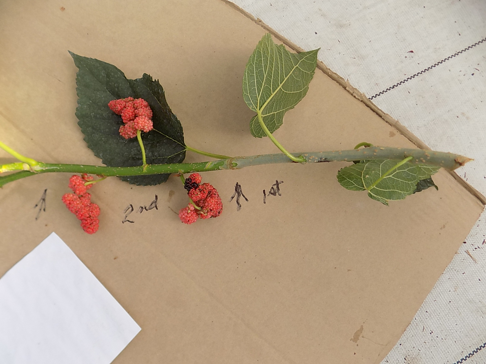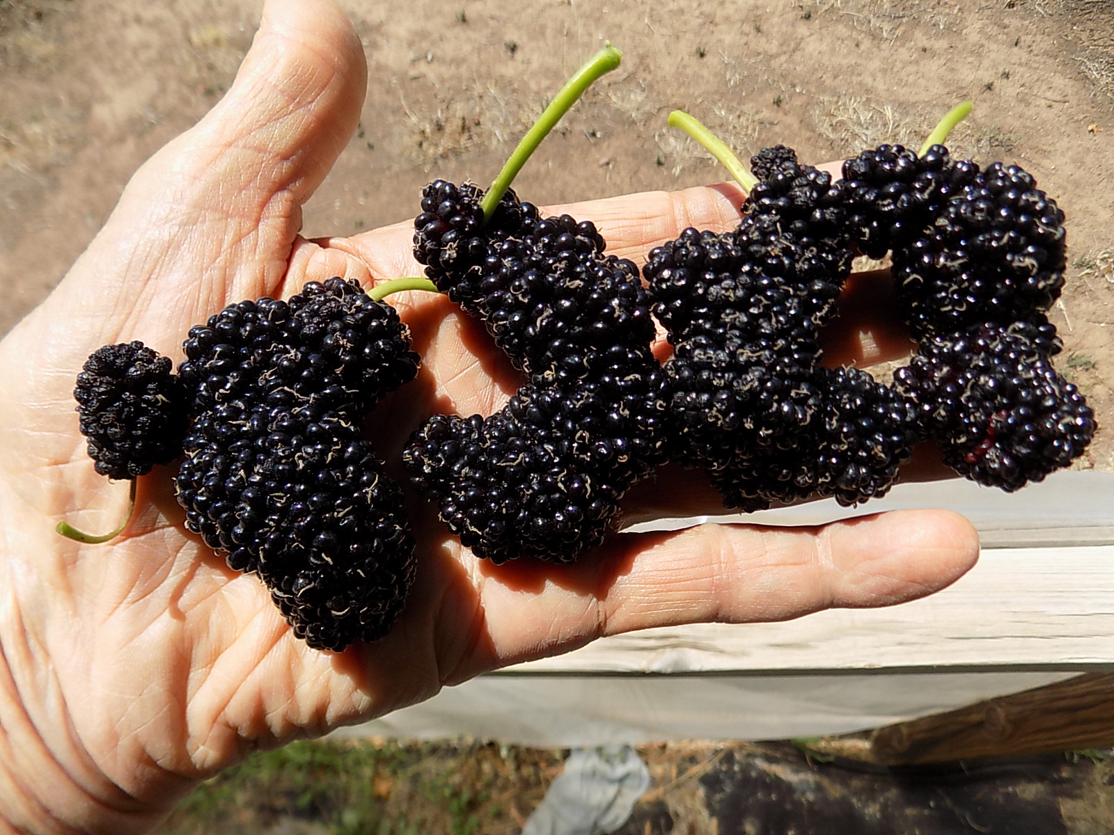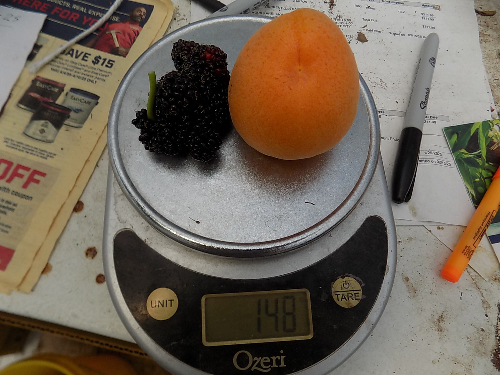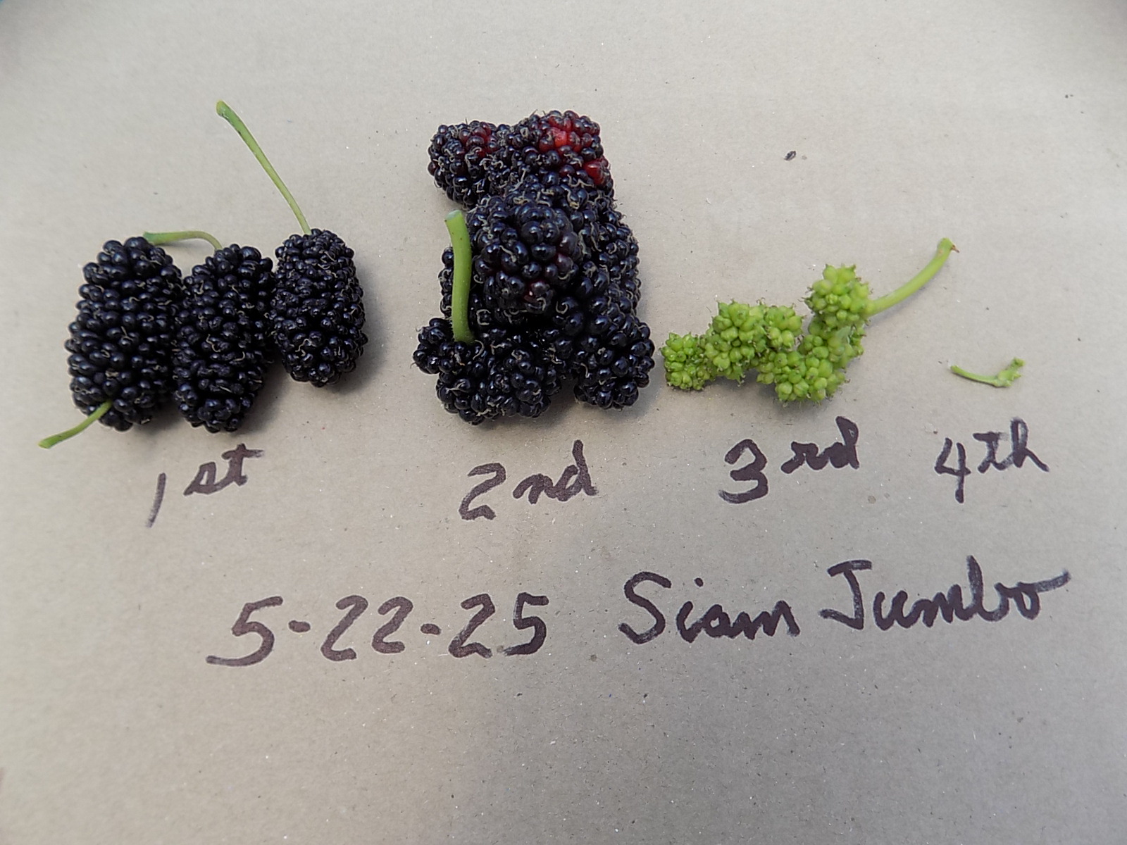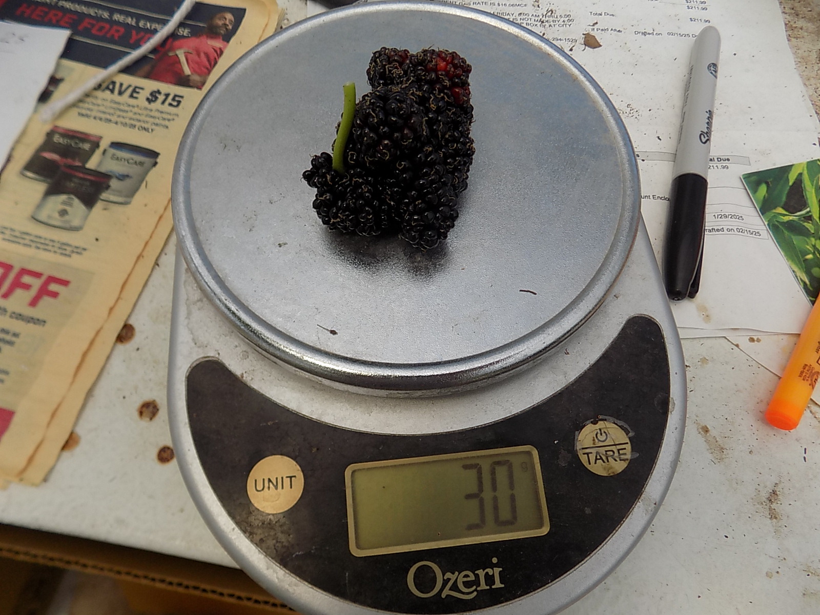 Second crop harvest is underway. Four berries from today that weighed 112 g, ave 28 g. And still eating the tail end of the first crop as evidenced by the tiny 2 g specimen on the left. I ate all for lunch and they were pretty good, not great. I need to measure brix next time. They get a lot sweeter if allowed to hang a few days after getting completely black.