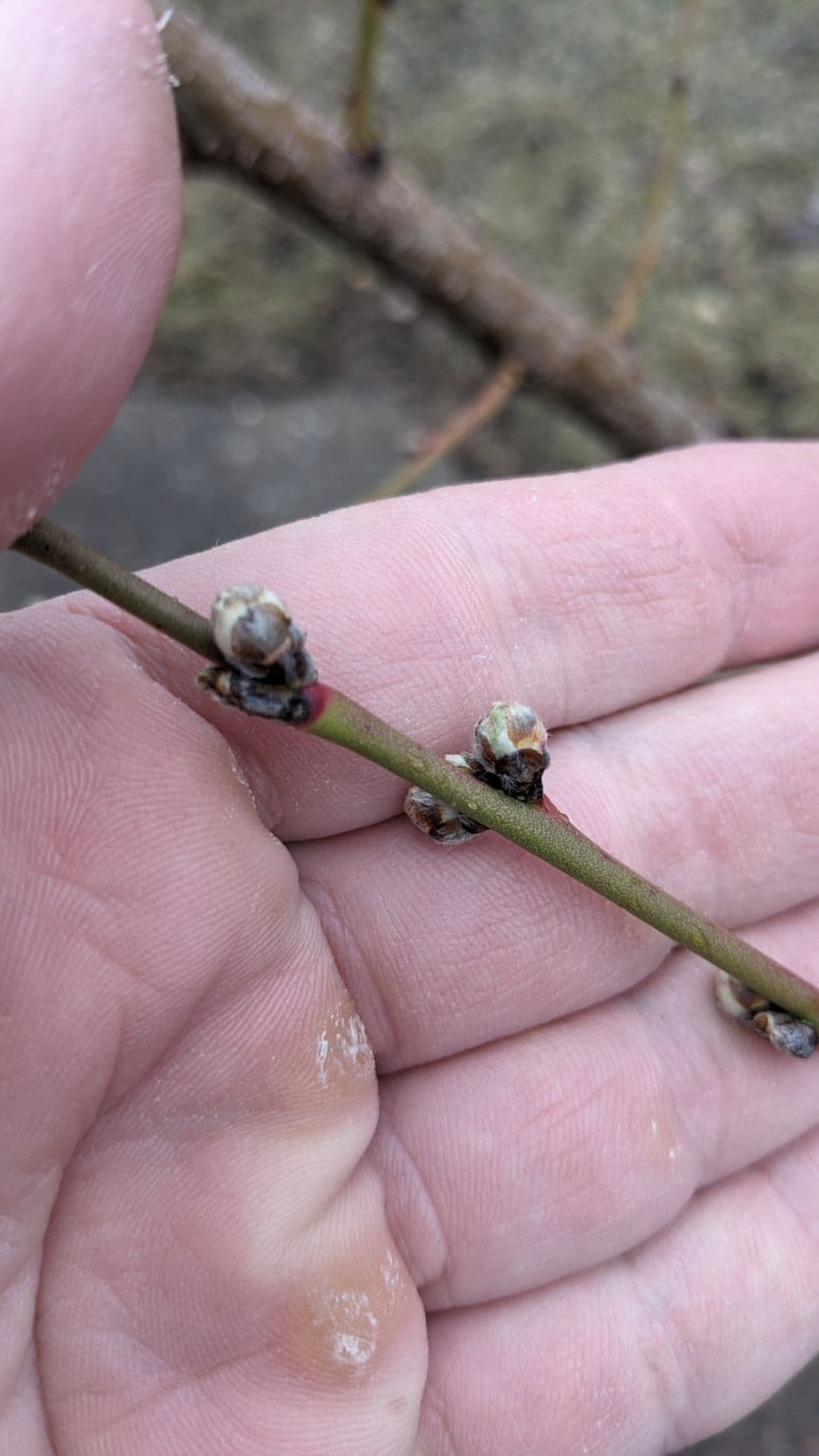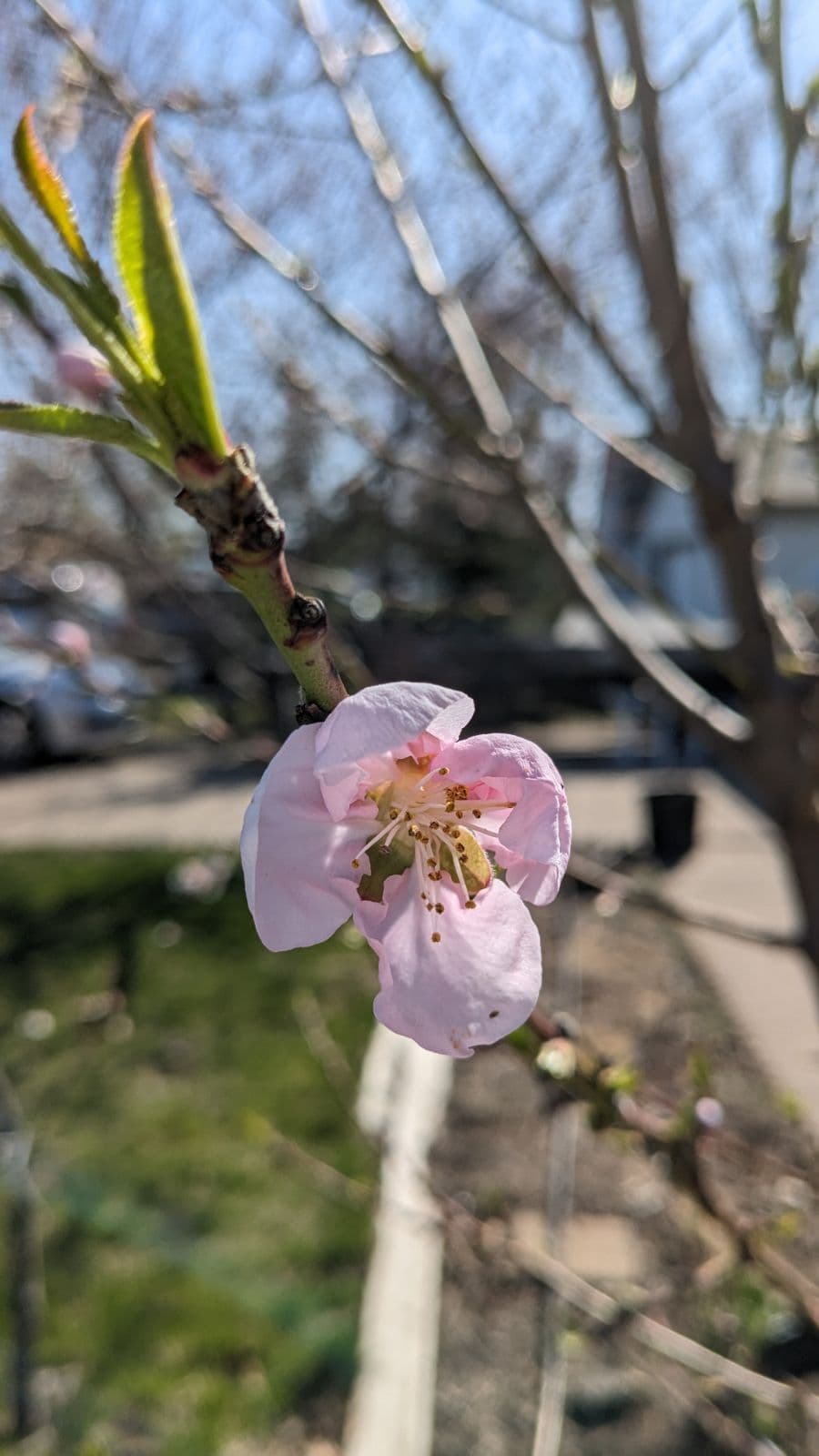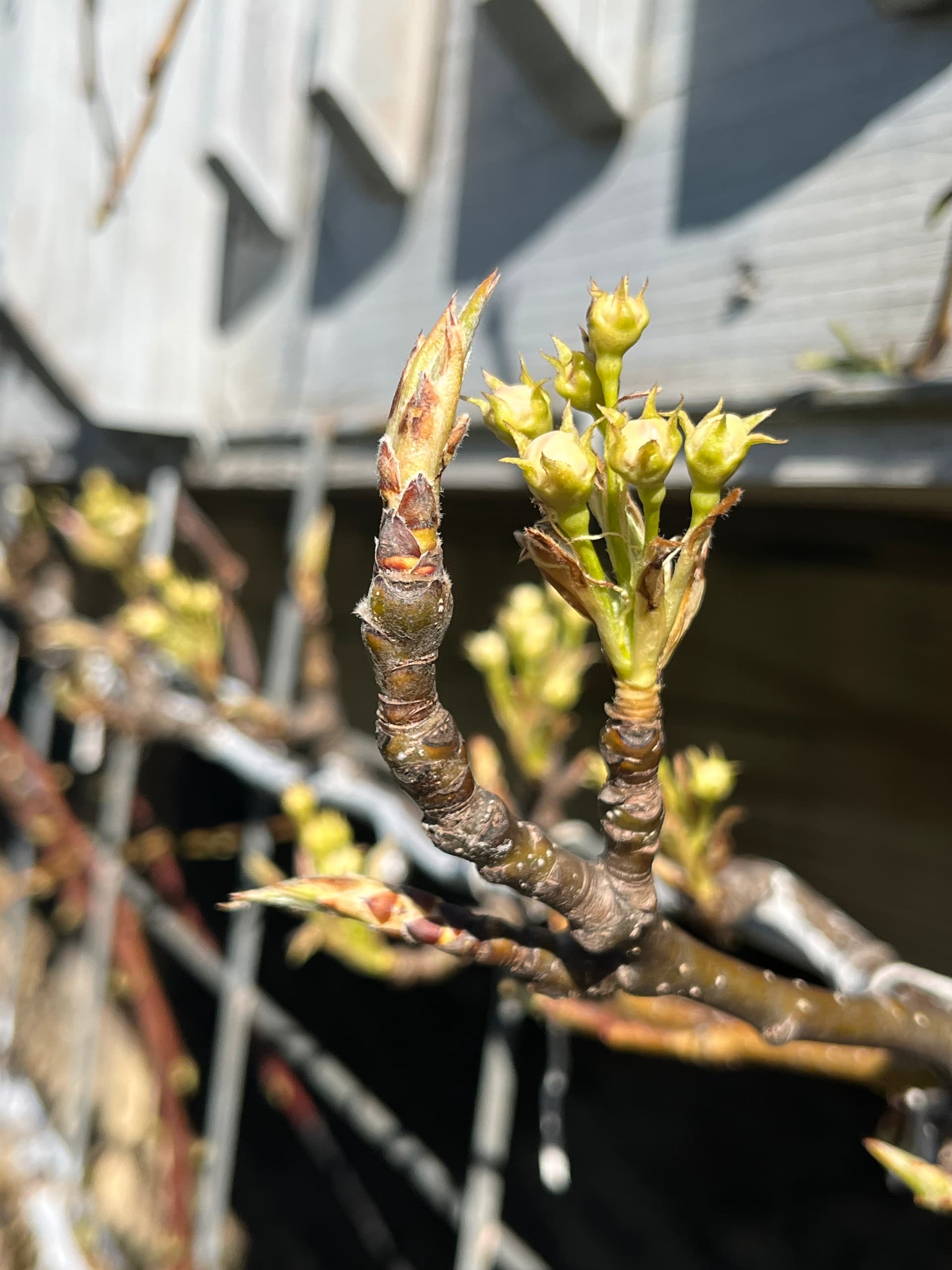 The apricots were blooming today but who knows how this plays out in regards to fruit set. Still haven’t seen any bees around. Peach showing some pink this evening.