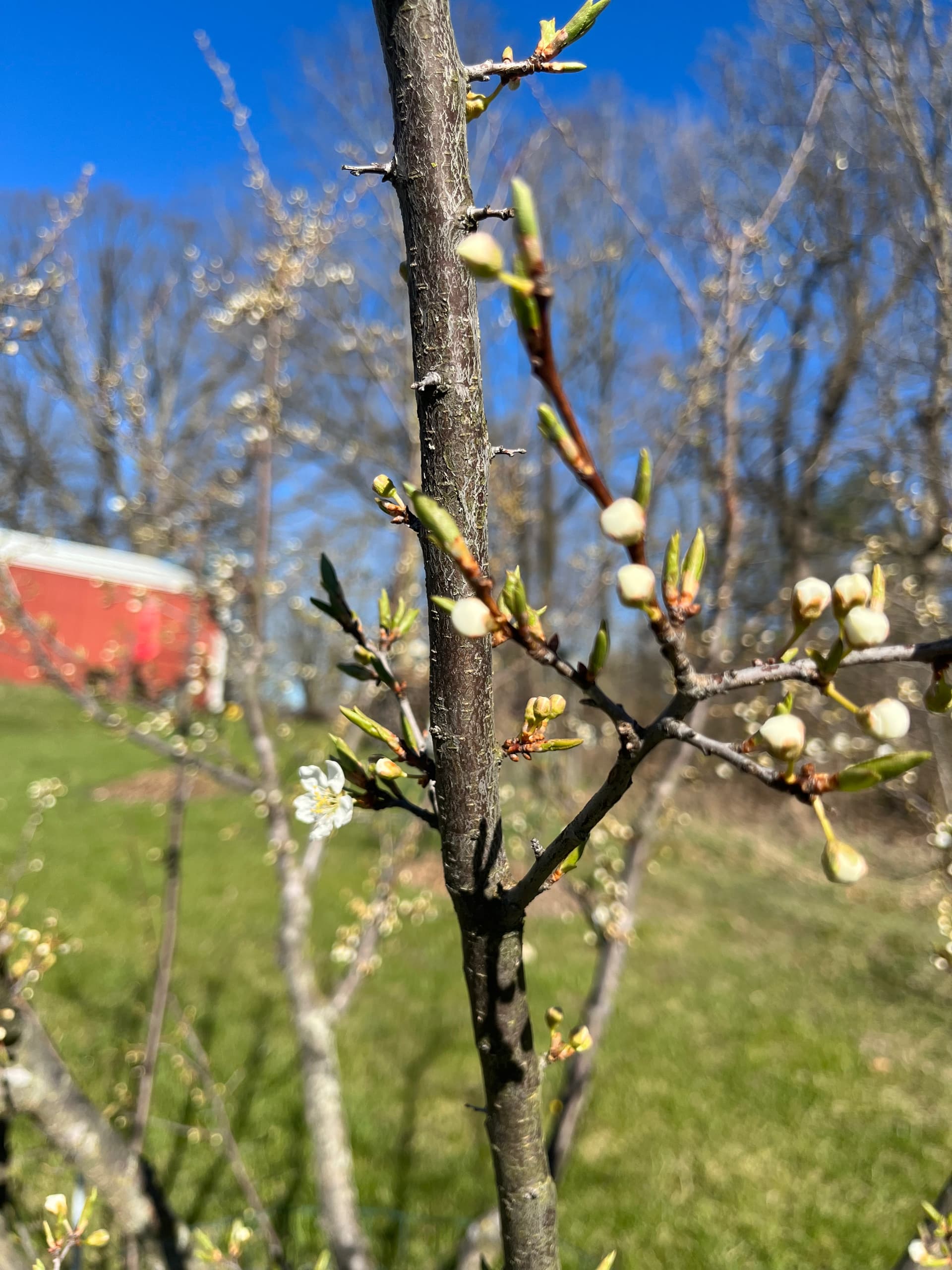 Still haven’t seen a bee. Bumble or honey. I’m starting to wonder if that early warm spell and the cold/snow after killed them all. I’m seeing little orange butterfly things on my apricots/pluots and flies.