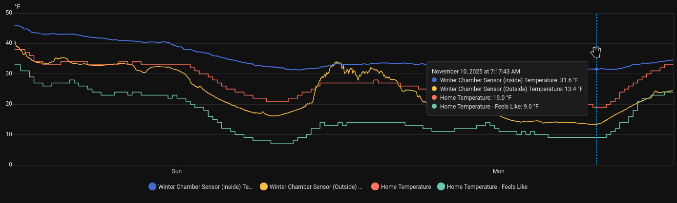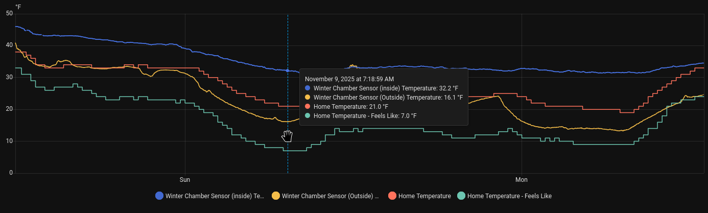guess were going to find out how hardy my potted seed/saplings and container trees, including figs, are going to fare after being left out the last two nights of lows into the low 20s/teens the two “Home Temperature” plots are just what the weather channel reports for my location. funny how different my “outside” sensor is from that but maybe not surprising given the sensor is in the share on the direct north side of the house: