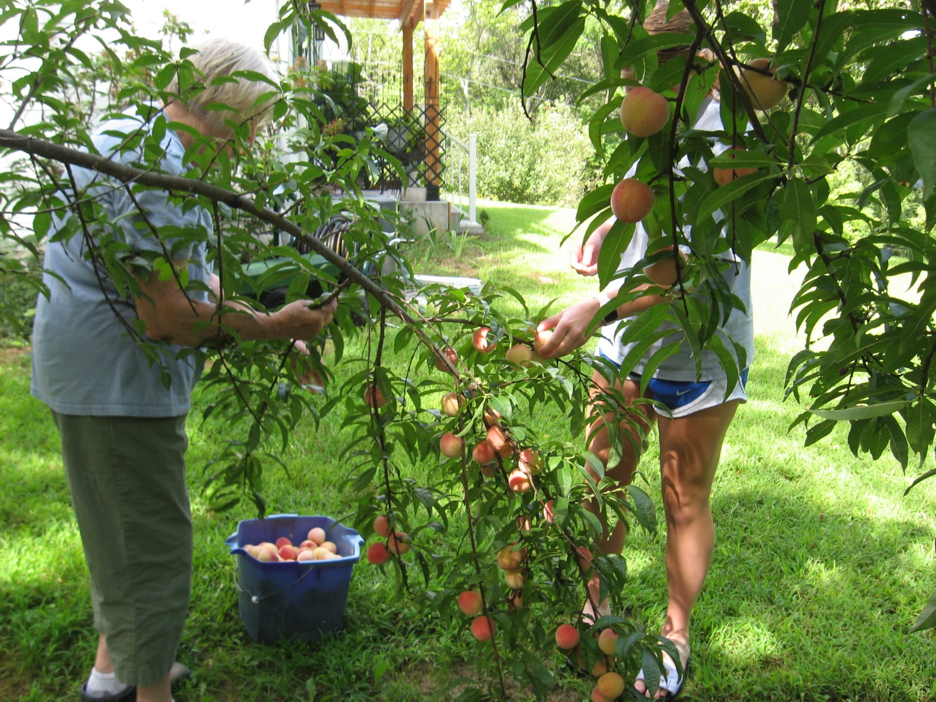 I expected the same to happen to this one that was just outside the back door. Our granddaughter happened to be visiting on harvest day and we got about 5 gallons of the biggest, sweetest peaches we could imagine. That very day we all pitched in and made peach jam, peach cobbler and still had plenty to give peaches to friends and neighbors.