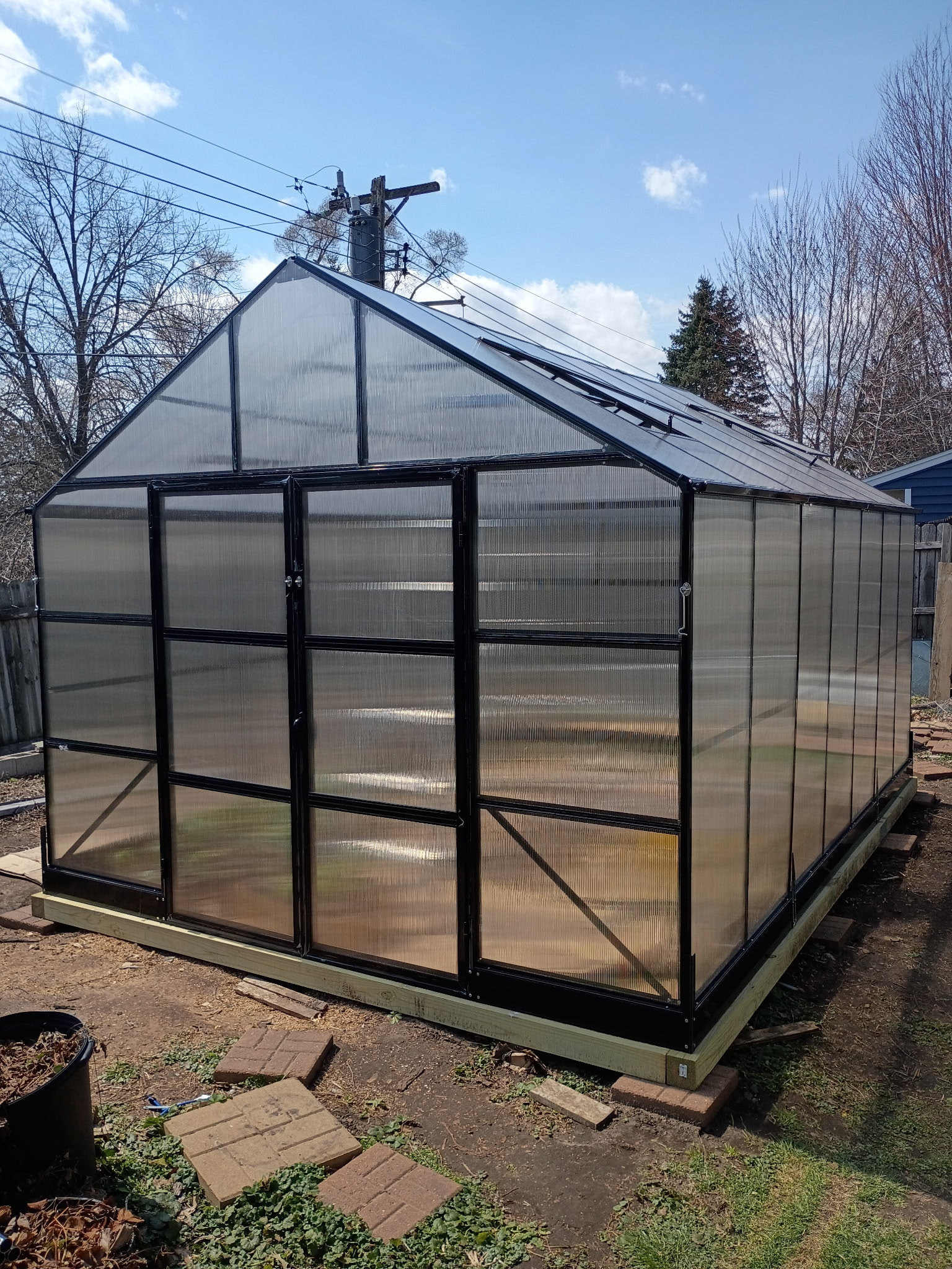 I finally finished my greenhouse i bought last fall. 10x14 double wall/aluminum. Would i do it again? Probably not. It was just me doing it and really requires some more hands just to speed things up. Over 300 bolts/nuts with various self tapping screws, etc. Whole thing will probably end up in the next county after a summer derecho! I still have to move dirt around/pavers/figure out a floor and some shelving. Anchor it more.