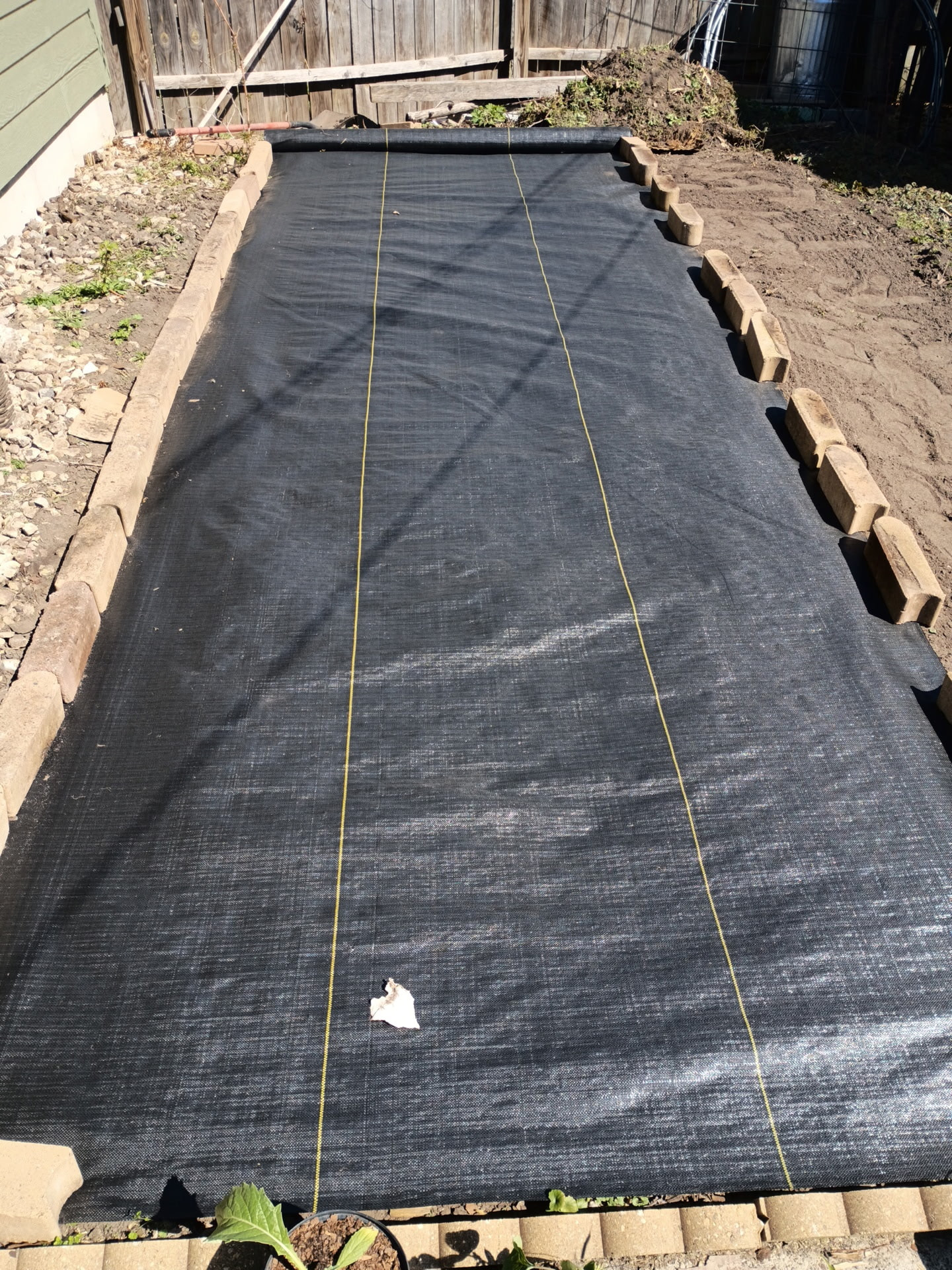 Got my first row of fabric down. I’ll overlap one more row in this spot. This will be tomatoes.