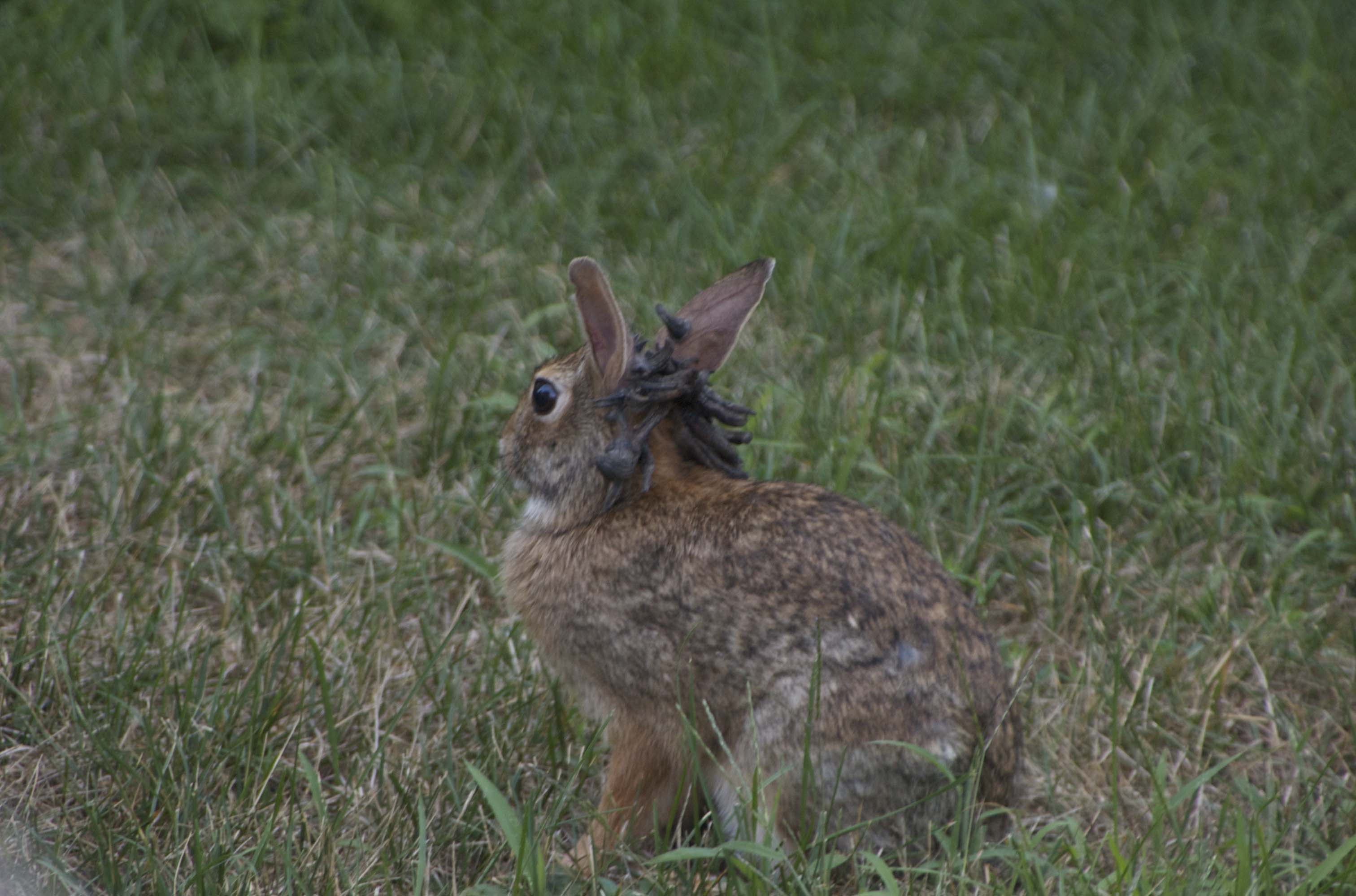 This is not the bunny that was in my yard- I only have a camera phone and it was too distant for a good shot. But, here is what it looked like. Some of the pics online have the growths on their necks, out of their eyes, all over the head. The one I saw just had it between the ears. We shot it with a pellet gun, which didn’t kill it. I haven’t seen it since though, I’m hoping it doesn’t come back.