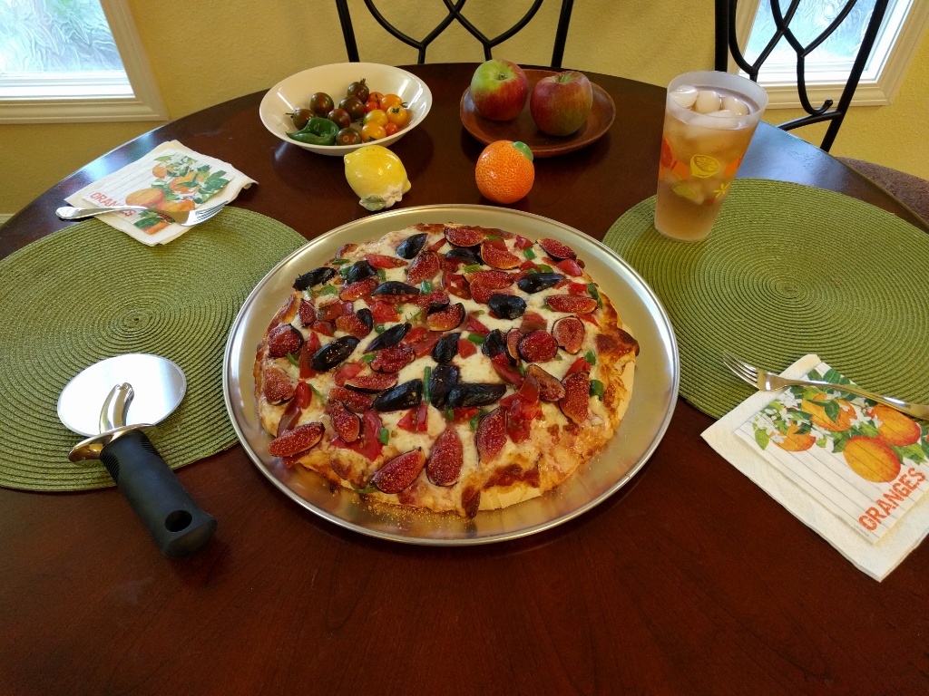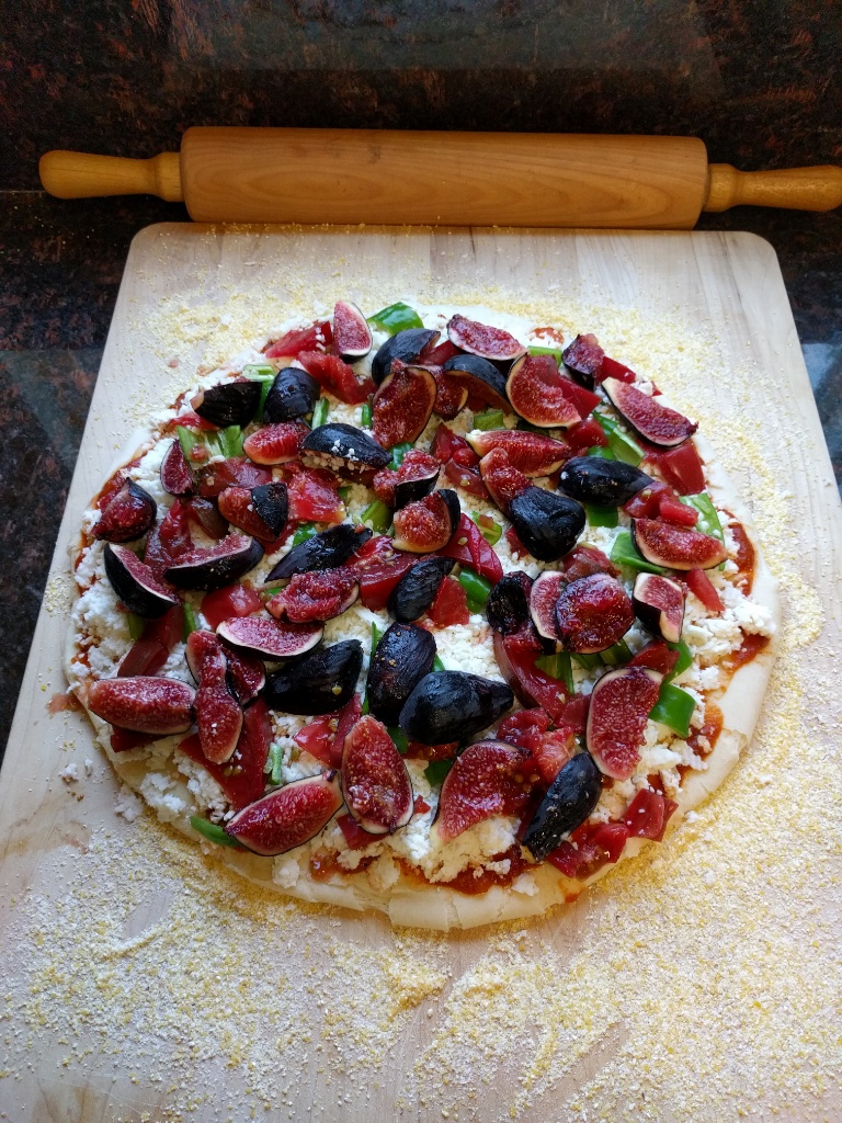Garden pizza made with VdB figs, Guajillo peppers, Black Krim tomato, mozzarella cheese, 1/4 cup marinara sauce, and Joy Of Cooking pizza dough.