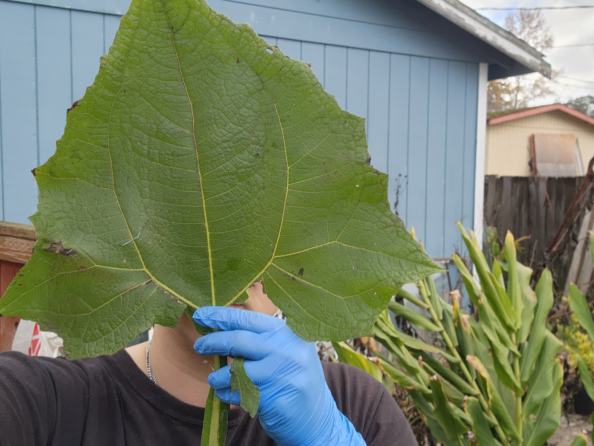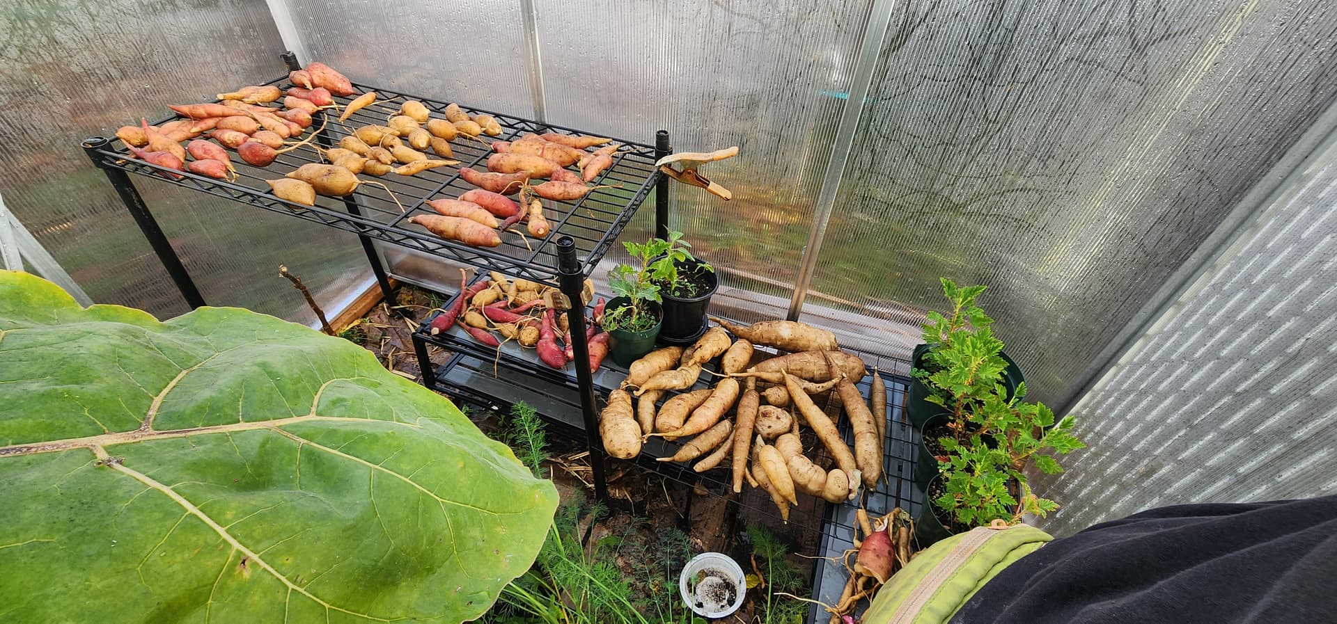 This is the volunteer yacon. It was able to get tall due to being supported by wire cage. HUGE leaves. Resting bitch face. Also tired. Put flower heads aside in a bucket to see if I can get more seed. The flowers are, surprisingly, still alive in my garage.