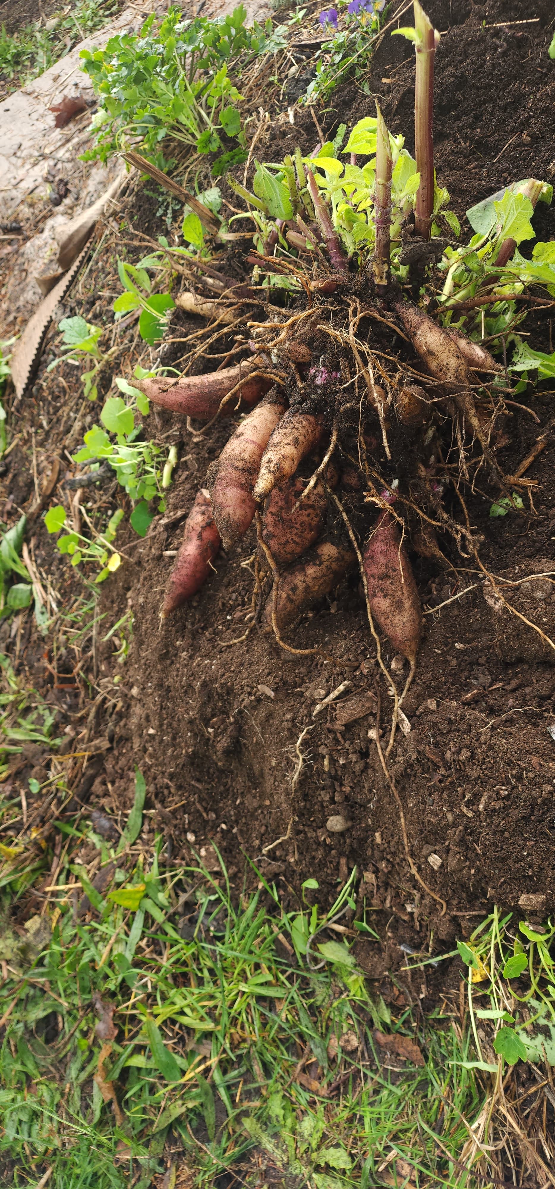 I don’t think I remembered to post pictures of my yacon… the big maroon ones on the right are my seed grown volunteer.