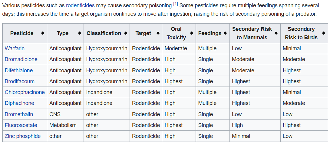 “Warfarin has the greatest non-target safety margin of all currently used anticoagulant baits, [and] efficacy is only marginally sacrificed for safety. Warfarin may be preferred where safety to non-targets is a greater concern than resistance.”