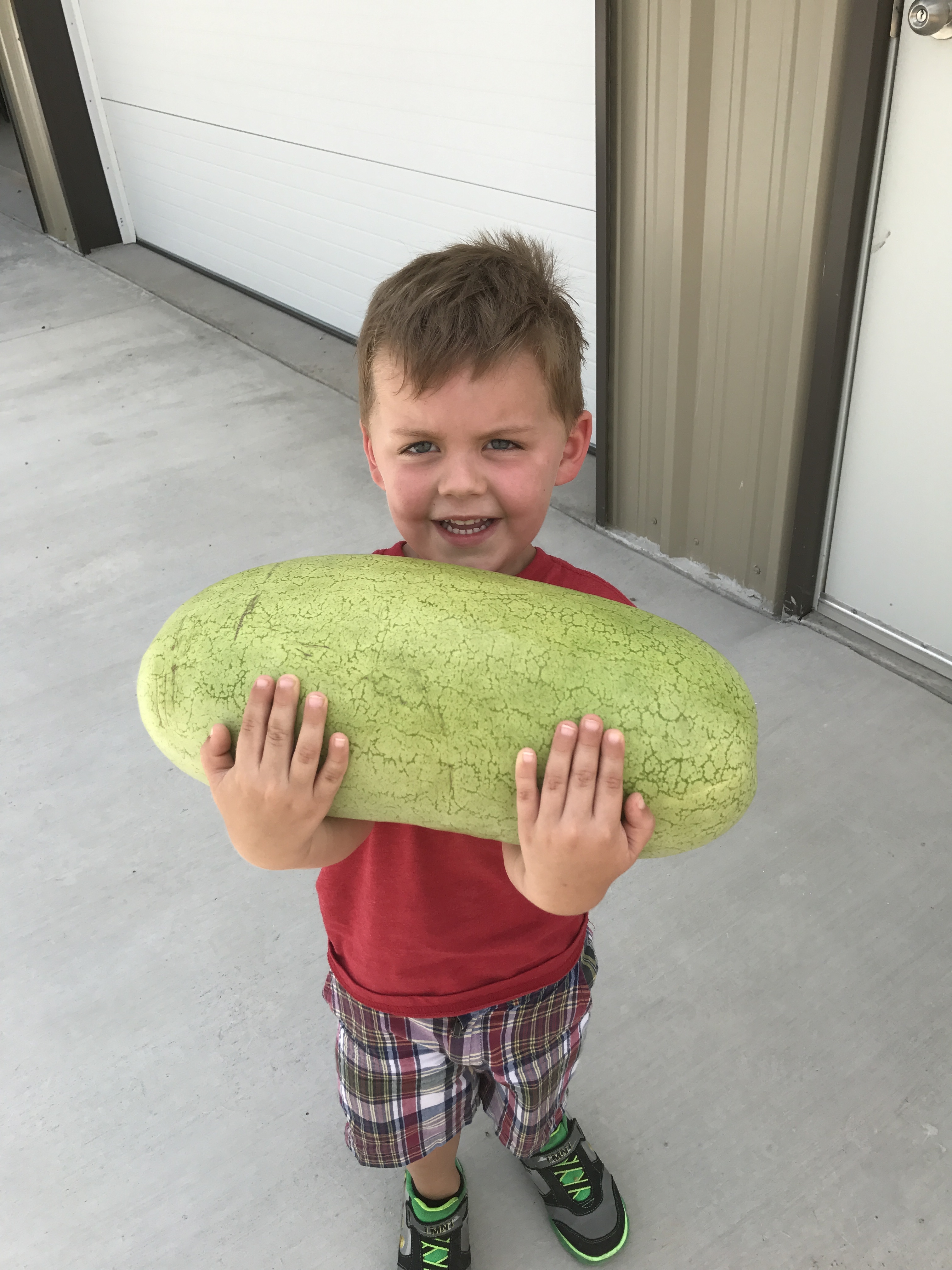 What a cute little boy and perfect looking Charleston Grey! Quite large, too. And yep, those are always my first melons to ripenâŚoften even before sugar baby/blacktail mountain which are reputed to be some of the first to ripen. Well done!