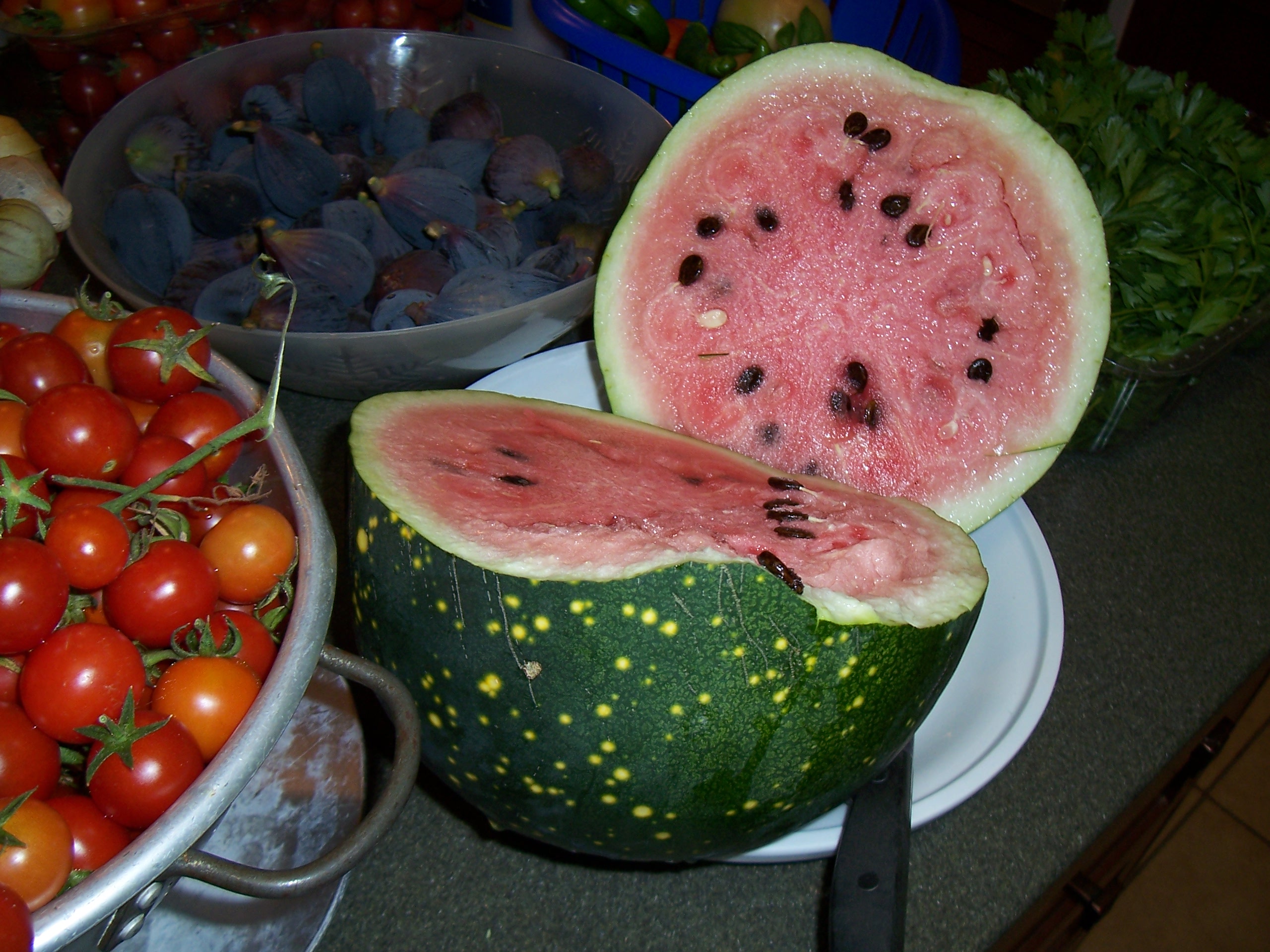 Today we picked two more Orange Glo watermelons, this will be the 4th and the 5th melons from the same vine. We had 2.5 days of cold non stop rain and the plants started to detiorate fast. Opened one and it was ripe, bursting with water and not very sweet, but still OK melon for the October. They had 5-6 weeks from when they got pollinated (late August).