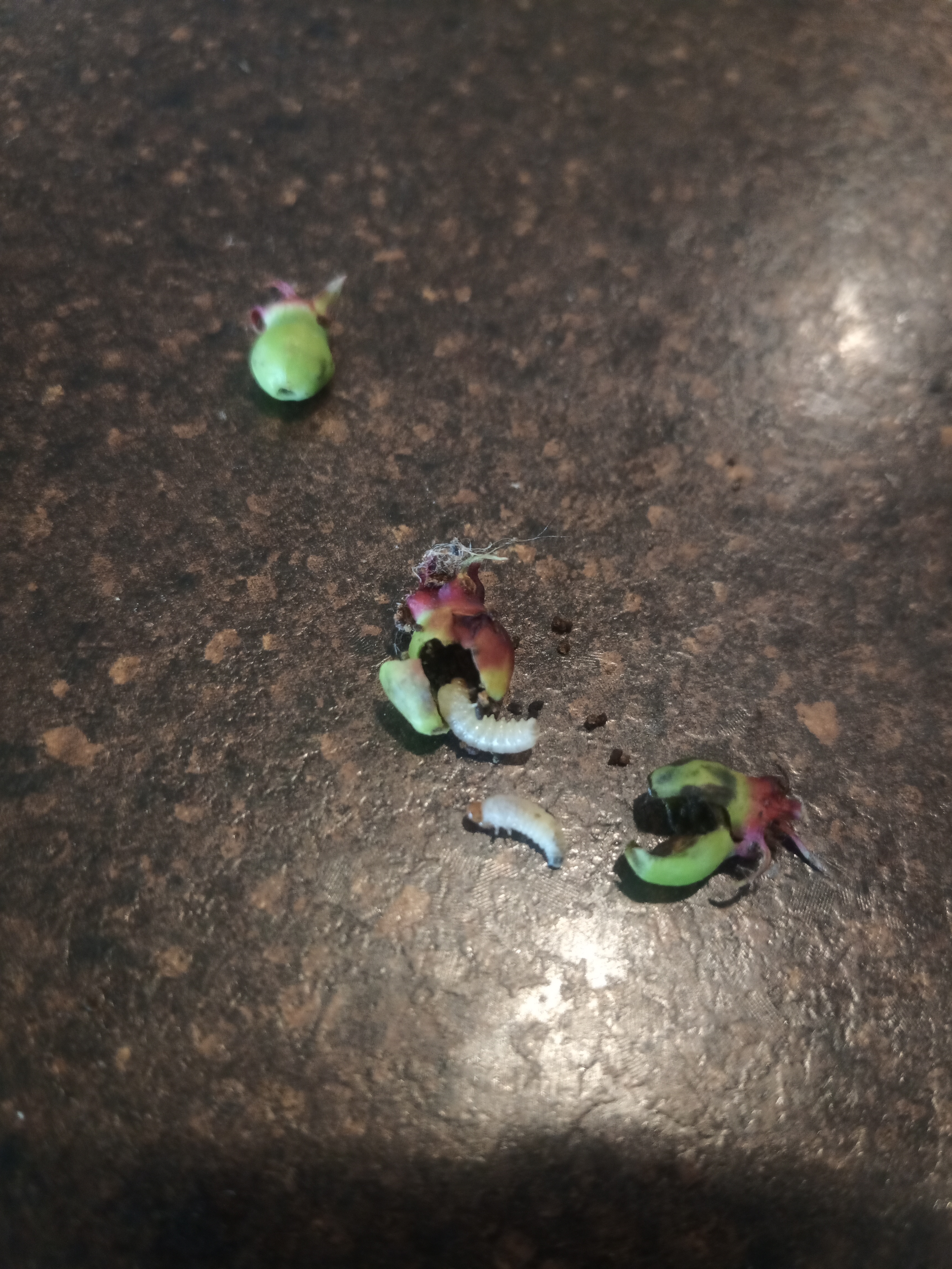 As I was inspecting my saskatoon and noticing fruit drop I saw they had a small dot injury. upon carefully slicing one open with a razor blade I found these worms inside of them.