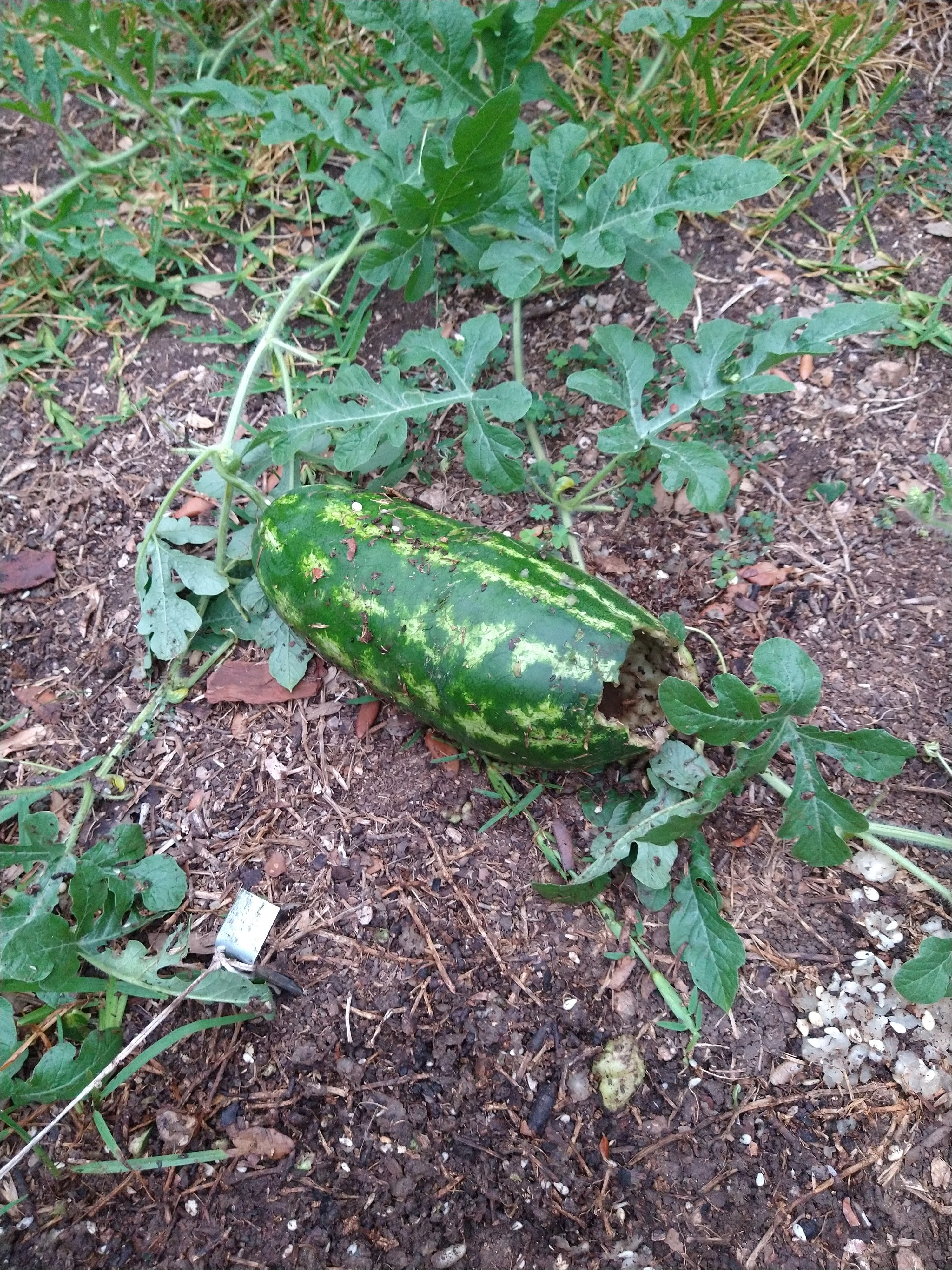 The watermelon is not ripe at all. What animal could eat it like this? I have 3 other melons in the field. How can I protect them?