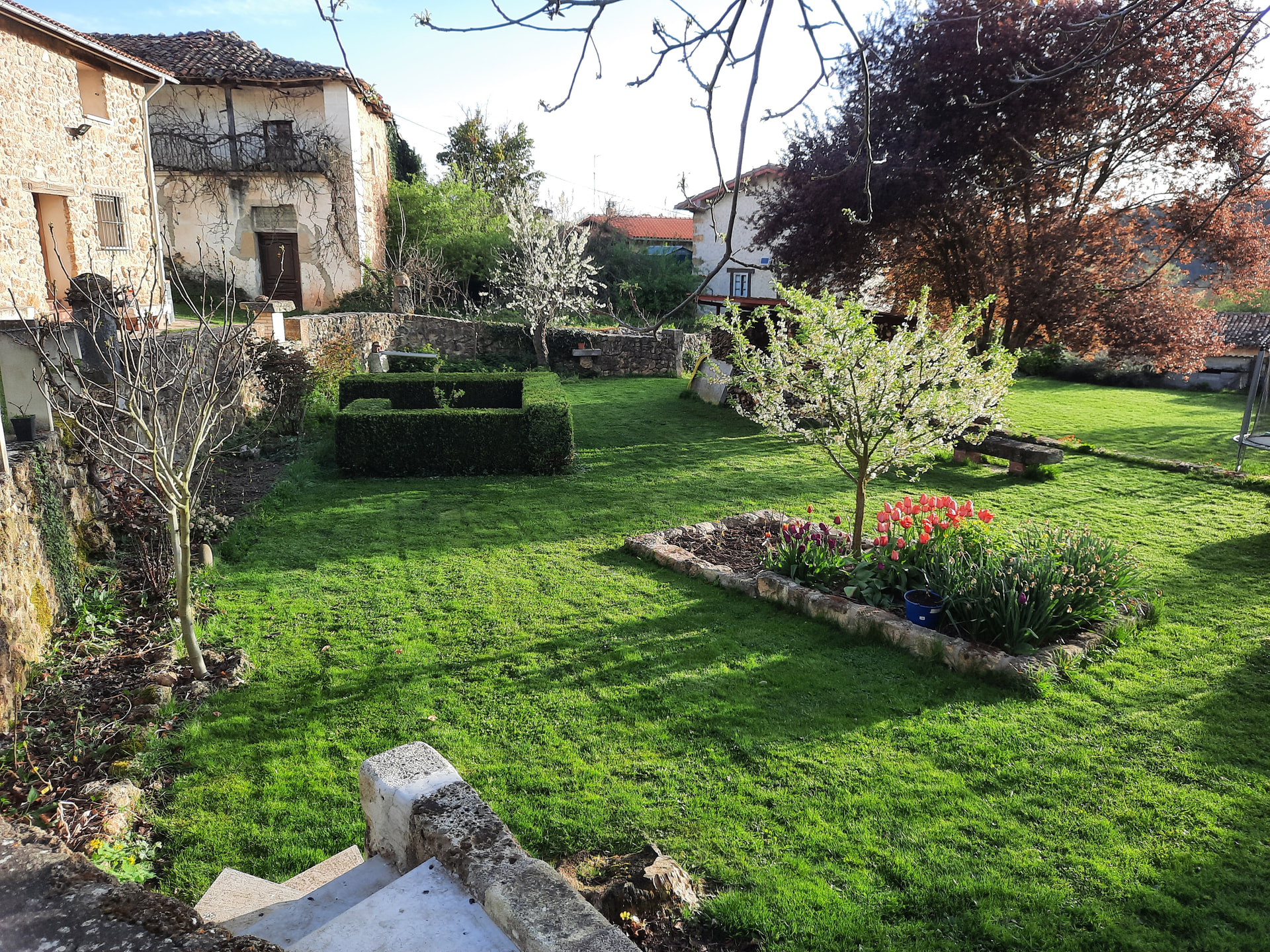 My garden in a small rural village in northern Spain. Trimming grass and shrubs.