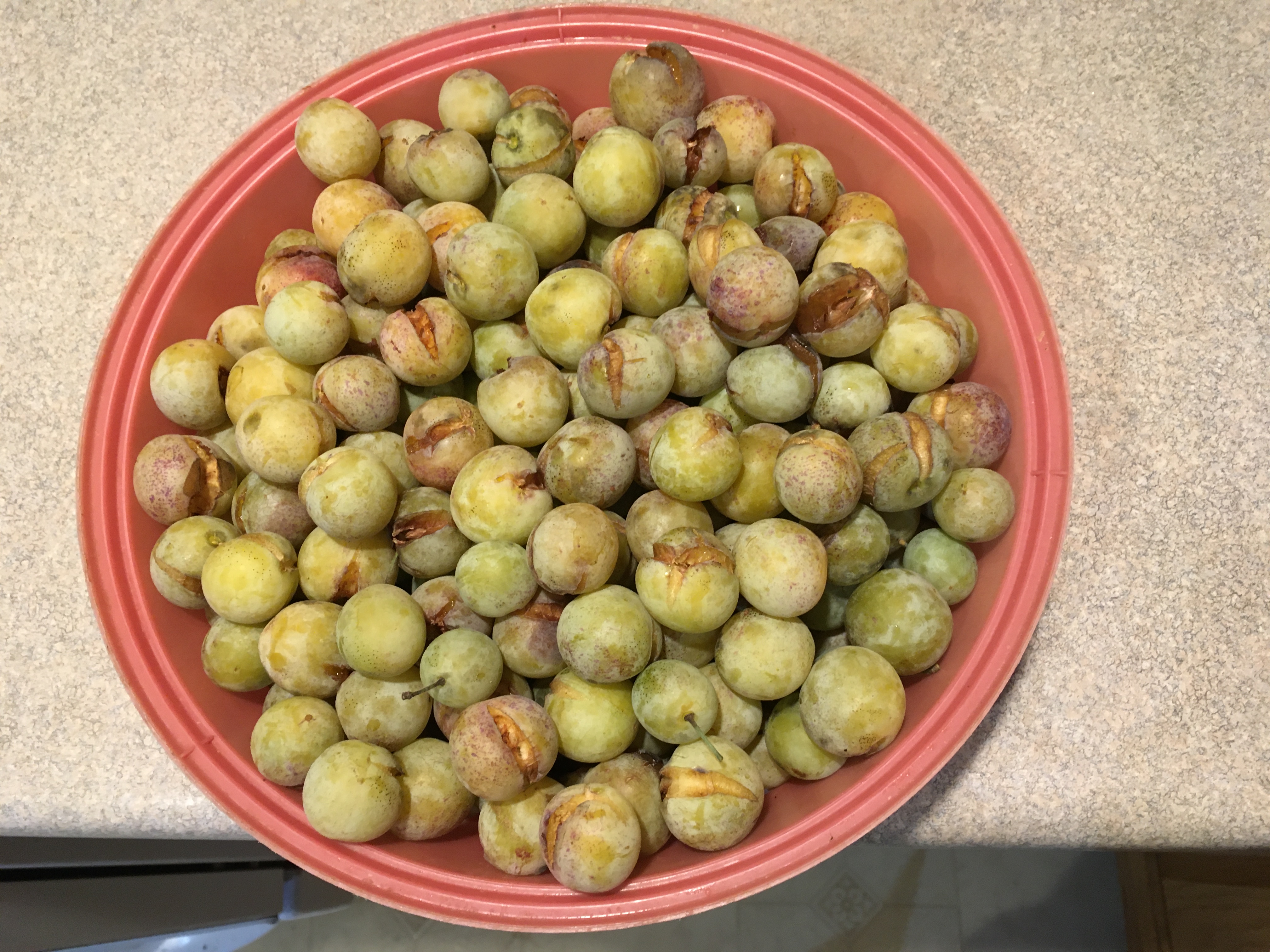 Mirabelle Parfume de Septembre. Lots split after heavy rain. Actual color is yellower than in the pic. Sweet but not as sweet as “normal” years.