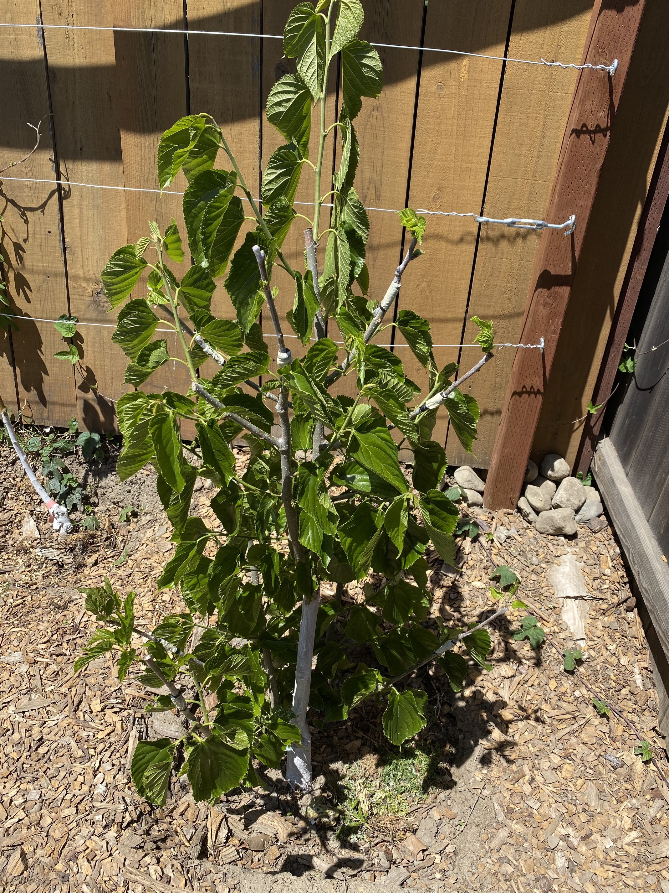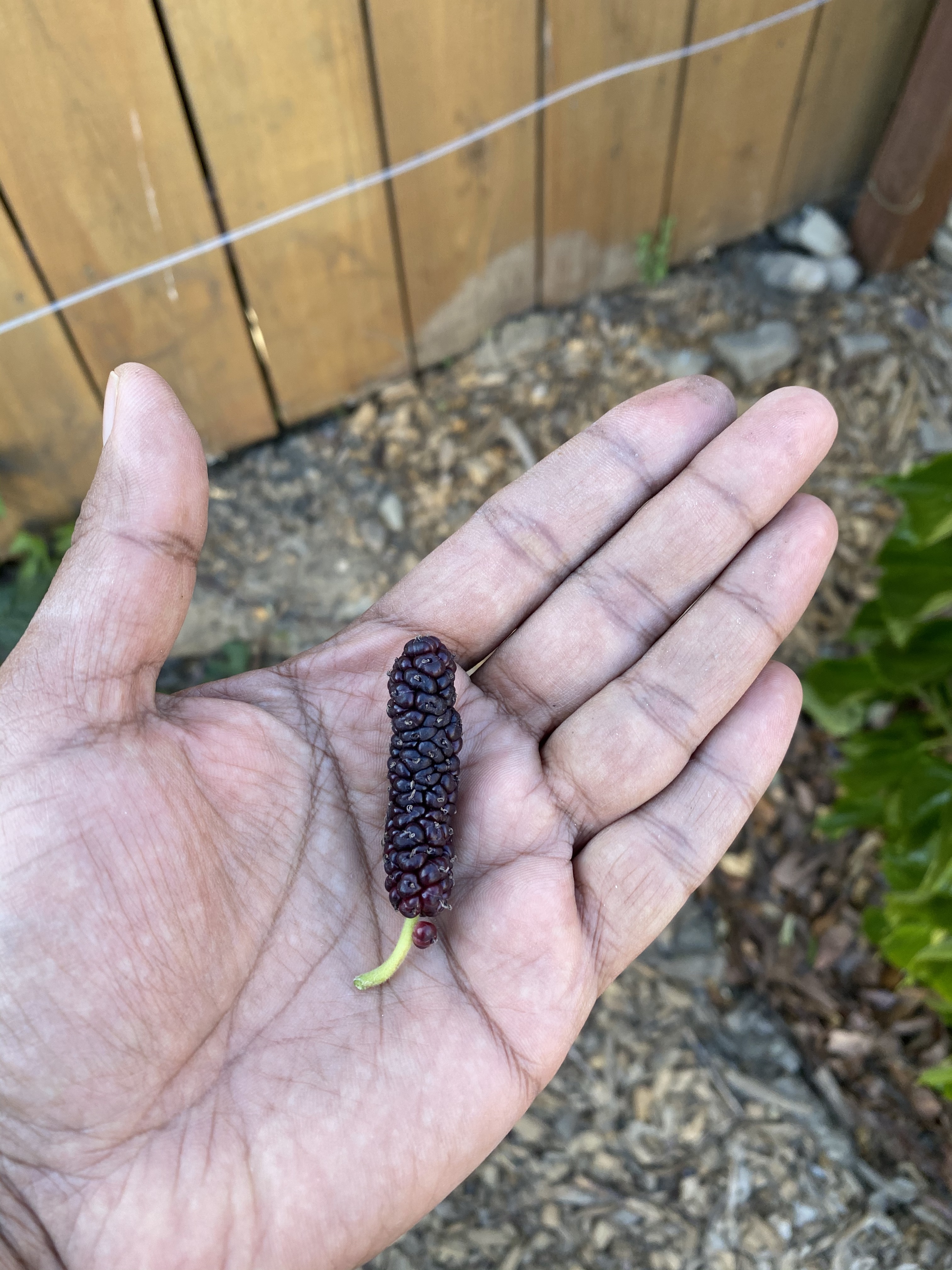 My first mulberry from my badly transplanted, still-in-shock, too-many-grafts-on-it Pakistan Mulberry tree. It tasted like a sugar cube. I thought I removed all the fruits, but this one hid behind some leaves.