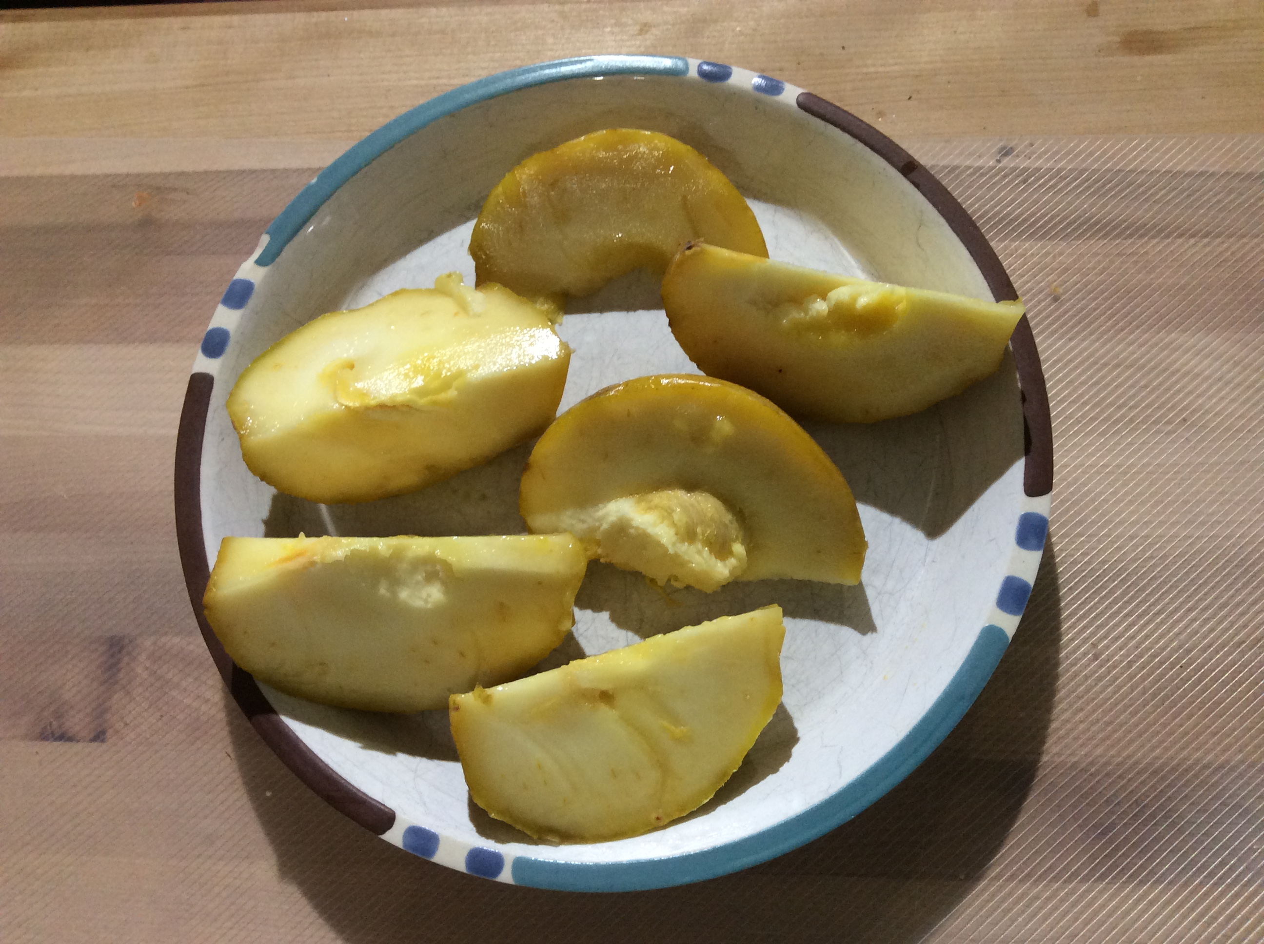I went to the local orchard store today and noticed that they had “Suncrisp” handwritten on the blackboard outside. I couldn’t find any in the store and asked, and was told they don’t have any in the store and that it must be up in PYO. I grabbed a bag full of Golden Delicious, making sure to pick up those with lots of russet, lots of yellow, and the few with reddish blush. I went up to PYO after and was told they picked the trees clean a few days ago. The store must have just run out.