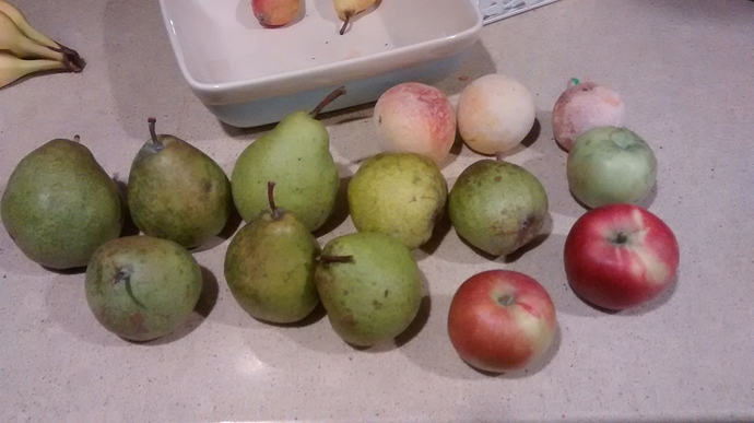We got to the orchard about 6:30, so we had an hour to get what we came for. She wanted a bunch of Maxine pears, Honeycrisp apples and blackberries. We split up, took separate wagons and headed out. She went to the berry patch and I’d hit the HC rows and Maxine row. A lot of the HC were on the ground, but there were quite a few still in the trees, so I picked about 10lb and then went over to get some pears, and picked about 12-15lb when she came by with her berries. They had been picked over pretty bad, and a lot of them were past peak, getting soft, and going to seed. She was only able to get about a lb and a half. I wanted to get some Jonagold and Sweet 16 apples, so I told her to take what we picked to the store and pay for them, while I got the other apples. I got about 6lb of both varieties, and got back to the store about 7:40. We paid up, I think we ended up with about 40lb of fruit! That included about 20lb of pears, and about 20lb of apples, mostly Honeycrisp. I wanted some Macs, and Pixie Crunch, but we just ran out of time. I’m glad we got to the pears and HC today, as they would’ve been gone by next week.