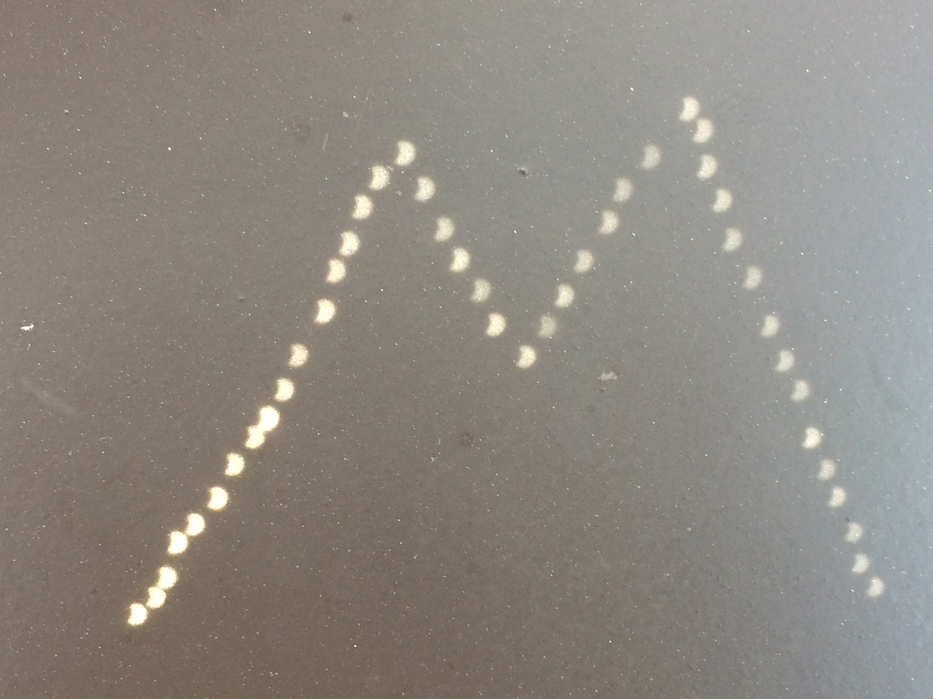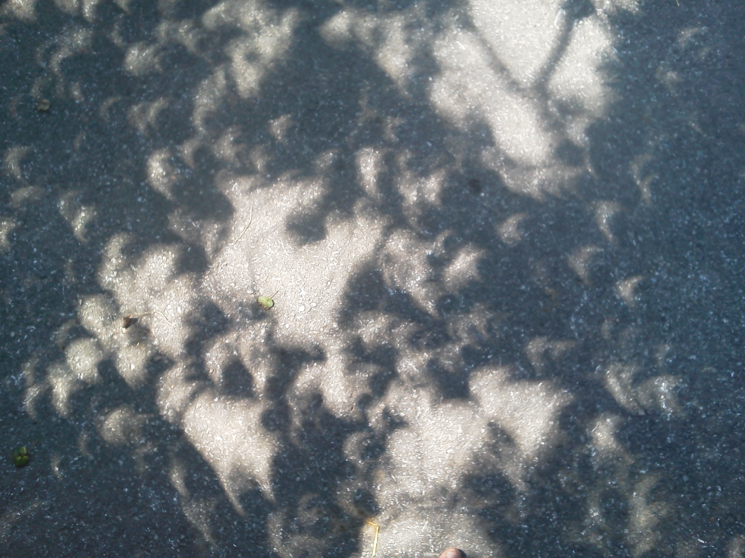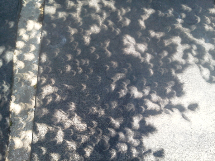 She left, and at about 1:15, they were showing the totality from Oregon. I just sat there watching in both wonder and disgust as I wished we were in Franklin by now. Here the partial started about that time, so I watched the effects outside, and tracked it thru my binoculars turned backwards towards the sun and the image projecting onto the wood deck. At about 2:15, the light had an eerie twilight look to it, it was very odd to see. I watched my animals to see how they responded to it, and didn’t see anything unusual with them.