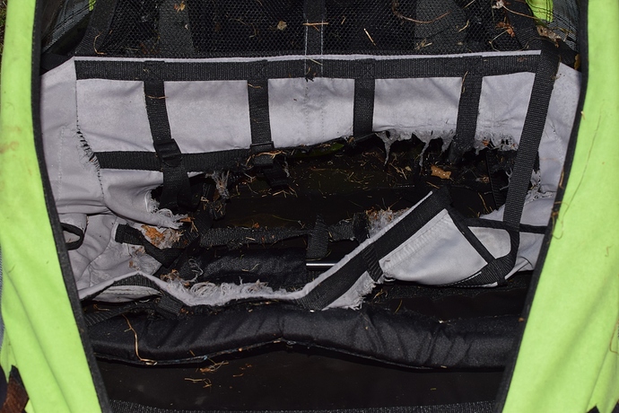 We bought ours to take the baby along on bike rides. All I heard about was how I’d have to bleach and sun sterilize it so that Hantavirus wouldn’t kill the baby. I patched it with some camouflage patterned material and it was good to go. And no the baby didn’t get Hantavirus. Over the years a surprising number of creatures have decided to make nests in baby related transport vehicles: double strollers, single strollers, jogging strollers, bike trailers, etc. Now that I think about it, it all makes perfect sense : cookie crumbs + dark place = alluring rodent hideaway. The question is, what were you eating in yours while your wife was pulling you around?