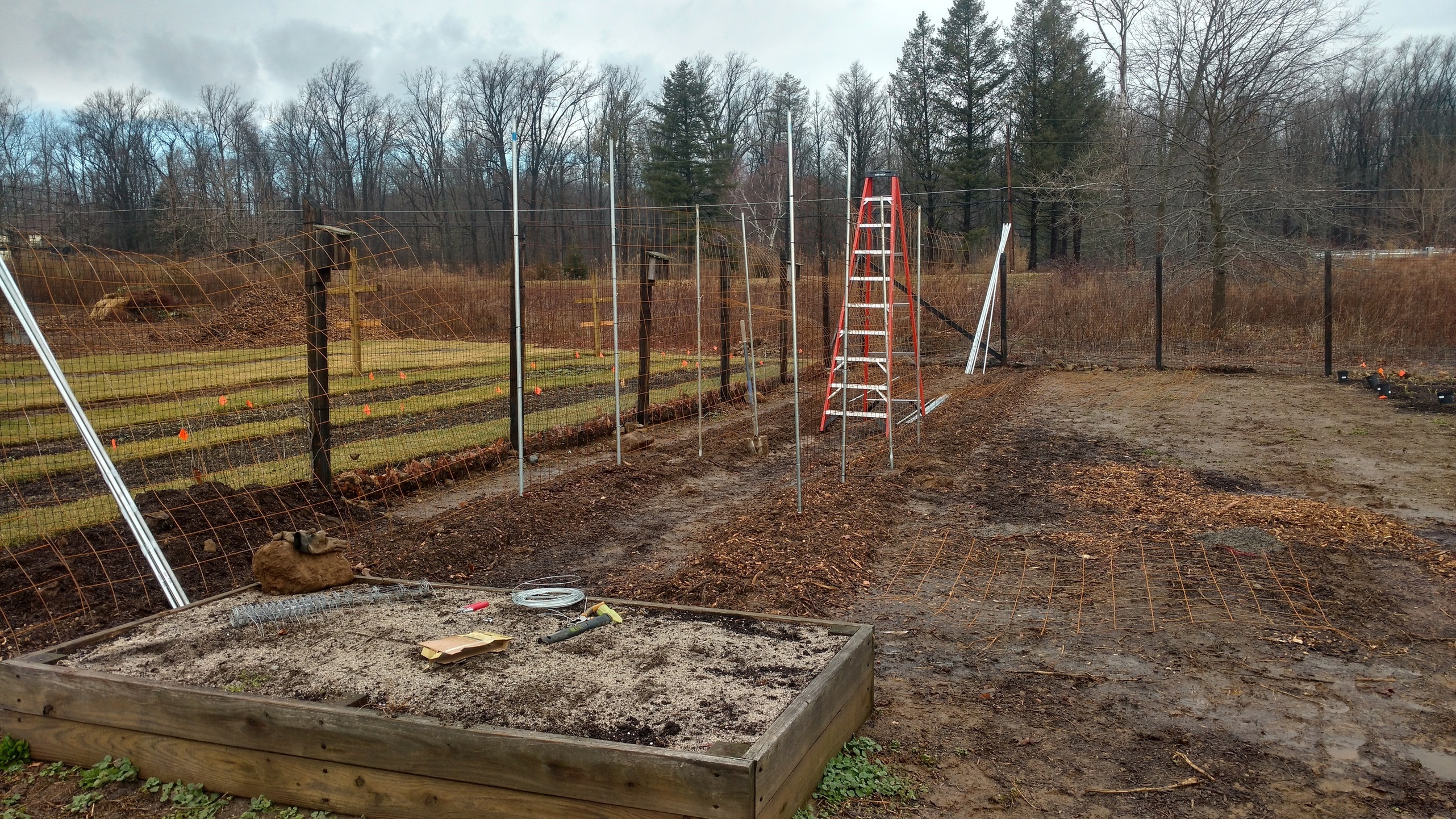 Yesterday I installed trellising at my work garden. 110’ long (50’ and 60’) by 7’ tall. Nothing like pounding in 10’ lengths of conduit from a 10’ ladder that is sinking in the mud!