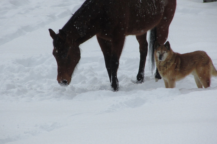 Thanks for the comments. If I can, I’ll look for some older pics of him, his snout is all white now, but it was almost black, that’s why I think he’s part GS. I particularly like the pic of him with the horse and the snow. He liked aggravating the horse, but never hurt it. It looks cold to us, but I think he likes winter, he’s quite furry. But, because of that, I think the summer heat bothers him.