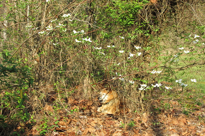 Our fearless watchdog waking up after a strenuous nap under the awaking dogwoods…