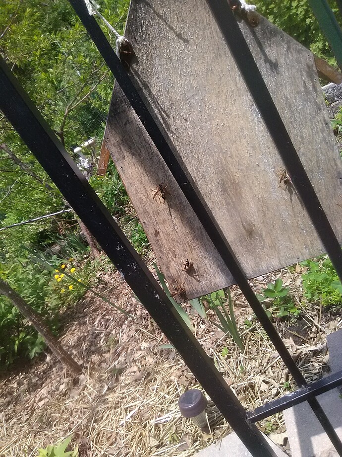These wasps were all over the back of our Mason Bee house, I was wondering why and then realized they were chewing up the old dried out wood, then taking the pulp back to their nest to make paper out of. You can audibly hear them chewing from several feet away, sounds like someone eating potato chips.