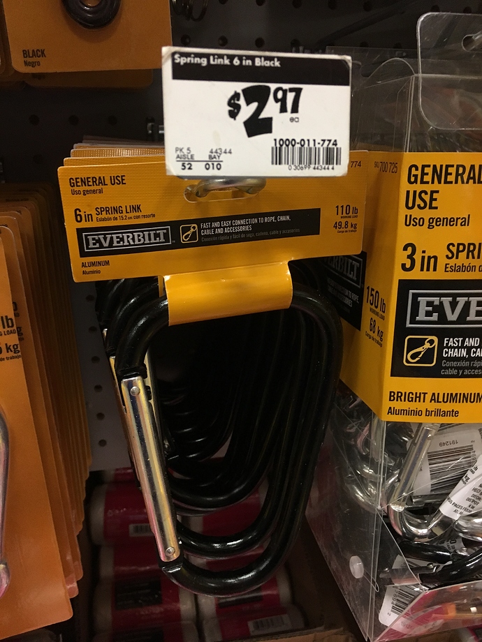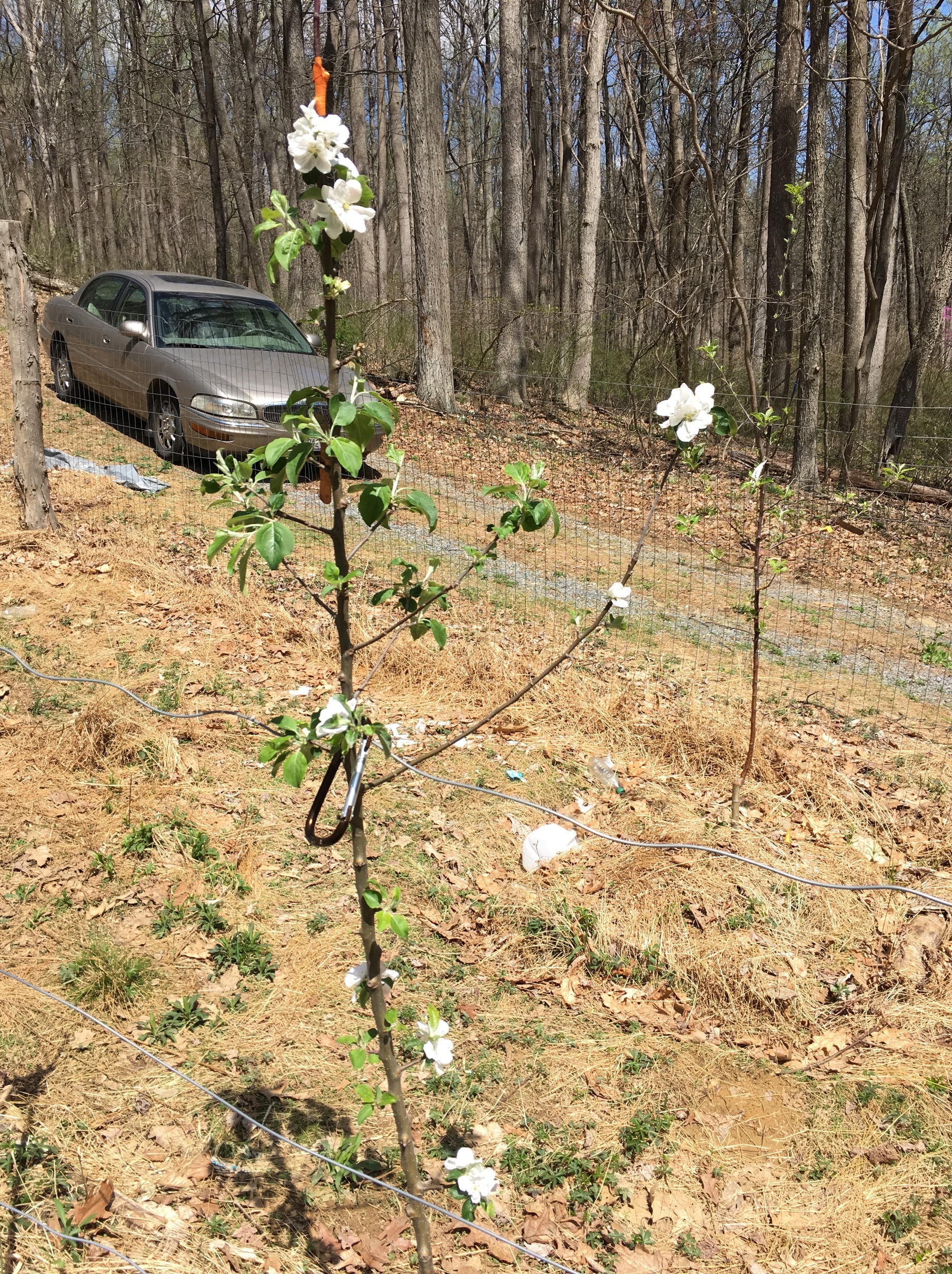 These are the carabeeners I use to clamp the tree trunks to the thick-guage wire. I bought out the entire stock of these at Home Depot… again. Now I have enough to support all of my dwarf apple trees. Various photos to illustrate how my system works: