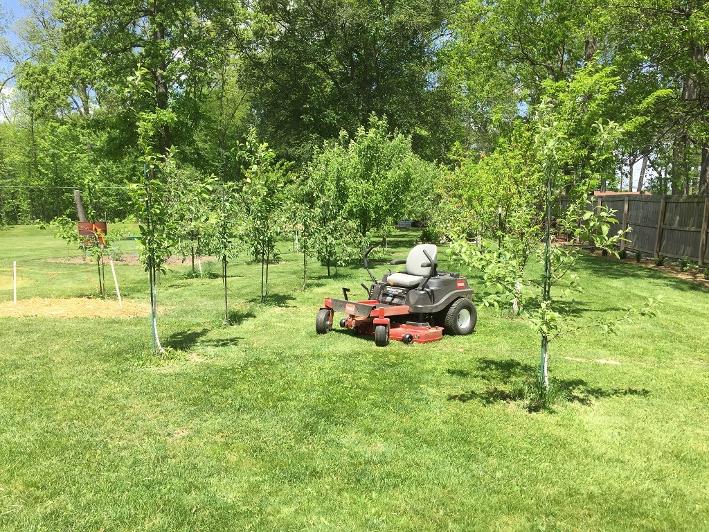 We don’t have a ZT mower, our property is too hilly to use one. We have a 48" Husqvarna. When I do mow around the trees, it takes a while, because I have cages around them. My mower can almost get around a bigger cage in one pass, but most of them are smaller, so it takes several passes. Even after that, there’s still grass I can’t get to. That’s a job for the weedeater.