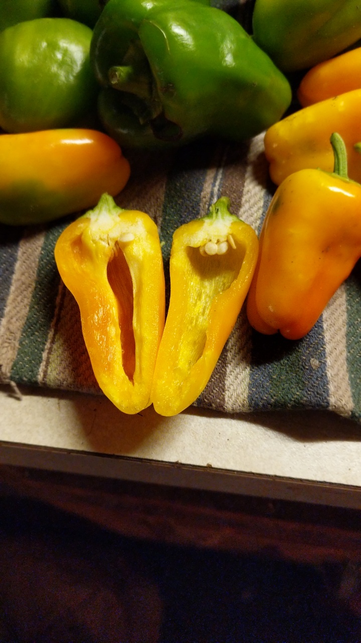 Green peppers still producing like crazy. Maybe someone has seen these little yellow guys before? I bought 6 plants and one of them was these little yellow guys. They were all supposed to be regular green peppers. They start green turn yellow then orange. No heat but very different from green peppers. Maybe sweet hot peppers?