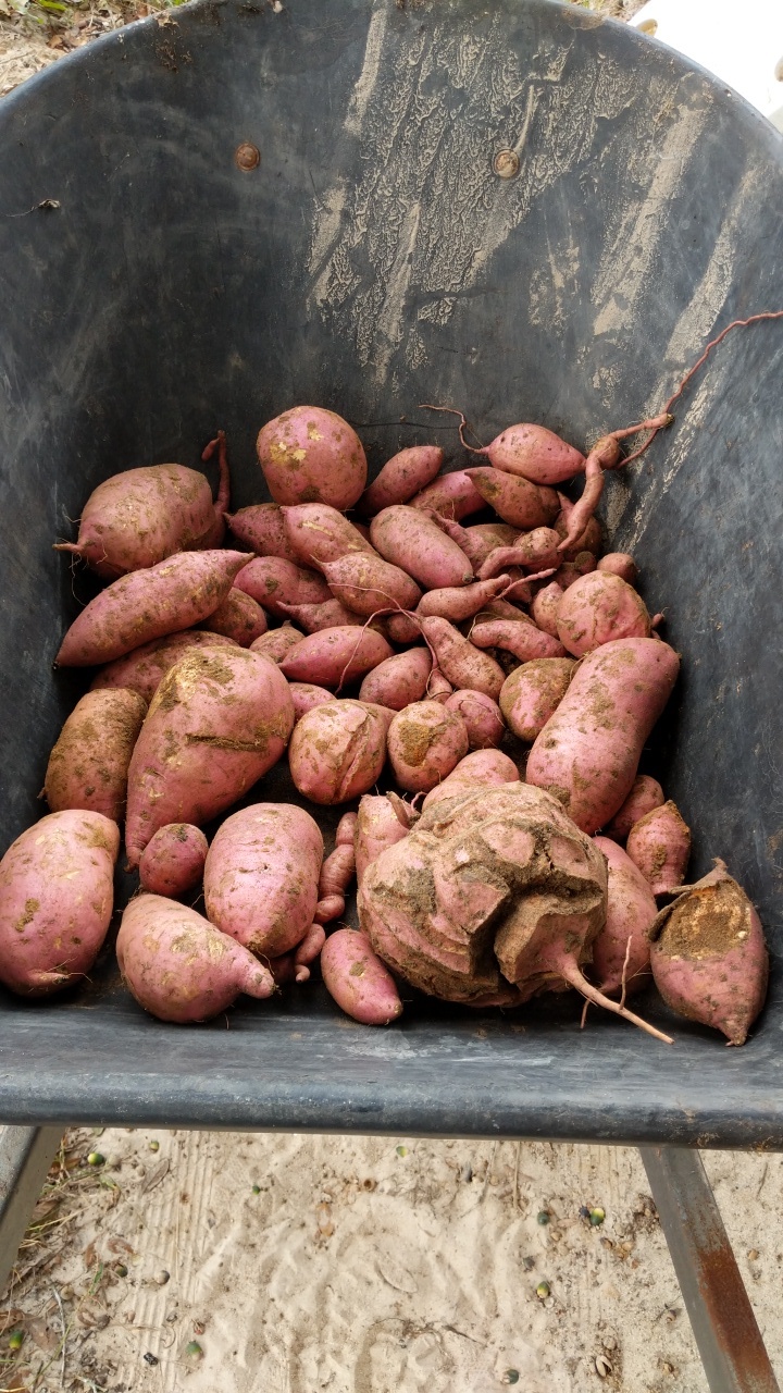Got my sweet potatoes today. Only two out of 6 survived and gave me this. Some kinda weird some.small some real big…weird. Must be my clay soil. I’ll prep the soil better next year and do a square not a row.