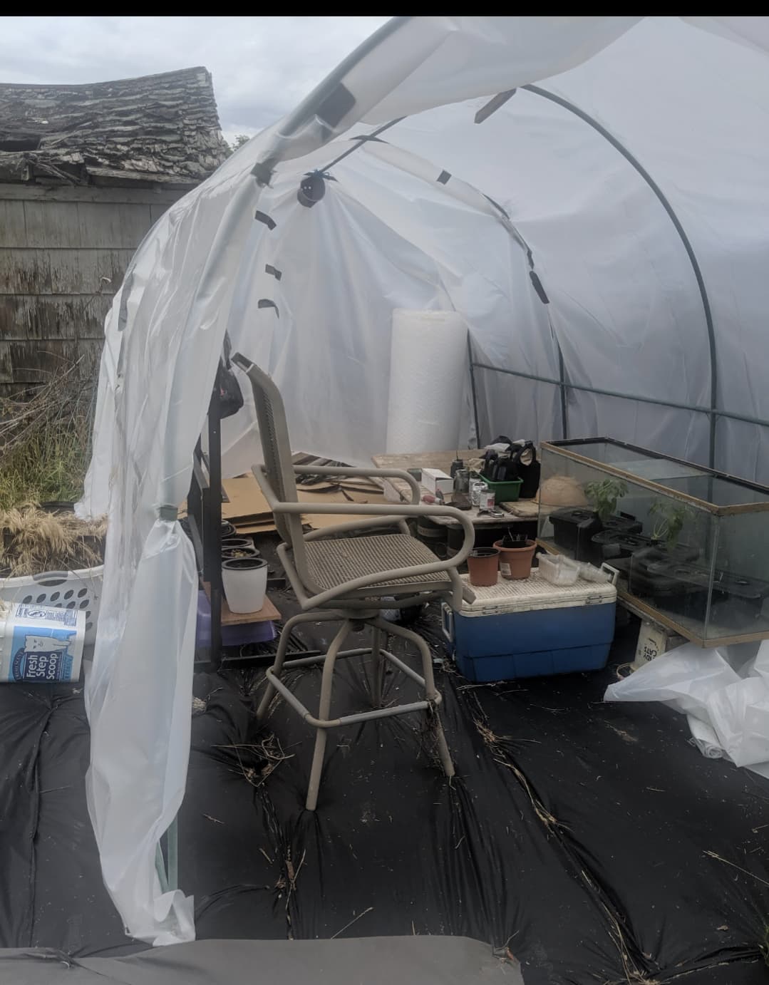 ye olde hoophouse being deconstructed for summer one year. lots of plastic waste- bubble wrap inside in layers, big greenhouse plastic layers to cover, etc etc. and smaller- 8x14 feet