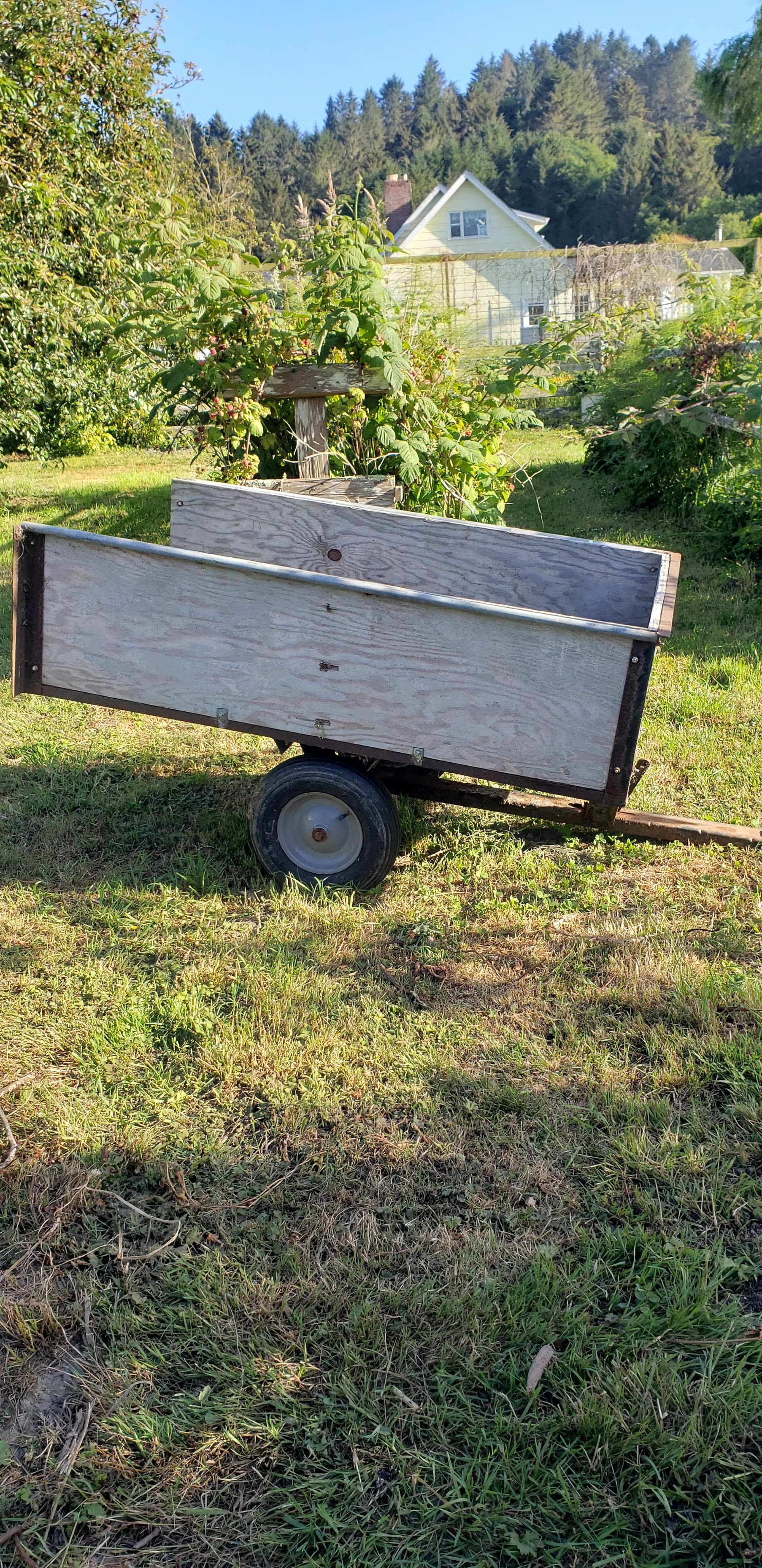 A box made of left over pieces of plywood. An axle made of 3/8" rod bent at 22+ degrees in the middle attached at the balance point.Two 26" bicycle rims on the ends. Couple of handles. It can take 10 gallons of spray or a harvest of squash. The only limit is my pushing or pulling legs.