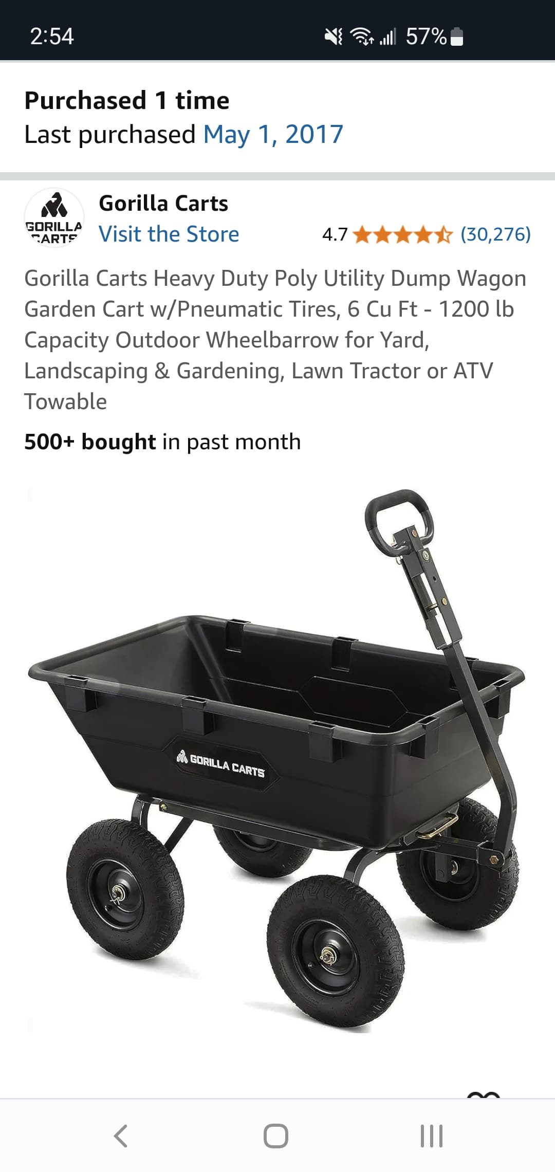 I’ve got a couple garden carts, a wheelbarrow, a tow behind cart for my mower, and two gorilla carts. I pretty much only use the gorillas. I have chronic cervical and thoracic pain and can’t push a load anymore, but it’s almost like traction to pull a load behind me.